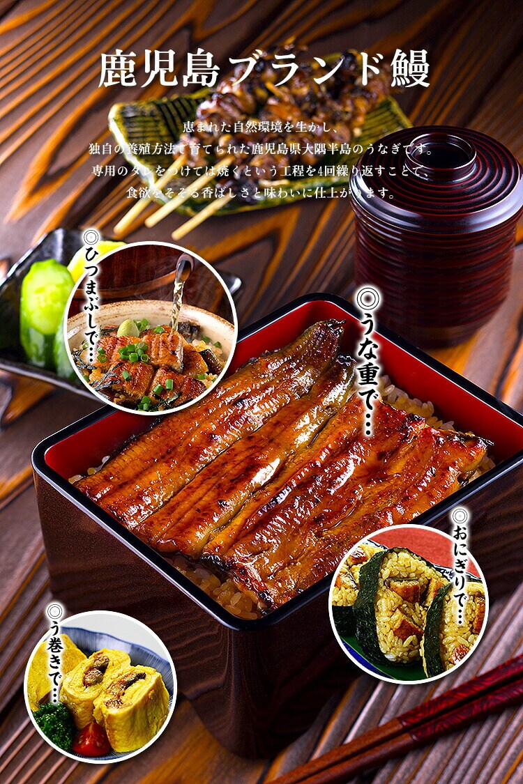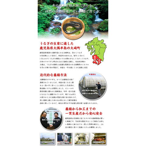 うなぎ生産量日本一の鹿児島県大崎町で育てられた安心安全のこだわりうなぎをご紹介!極上の「長蒲焼き」と食べやすくカットした「カットうなぎ」と「きざみうなぎ」の贅沢な詰め合わせです。おいしさの秘密は「焼き」と「蒸し」の加工にあります。しっかりと焼いて、よく蒸し上げ、さらに専用のタレをつけては焼くという工程を4回繰り返すことで、食欲をそそる香ばしさと味わいに仕上がります。脂ののった肉厚の極上うなぎを一度お試しくださいませ。(うなぎランキング1位獲得/2015年5月25日)