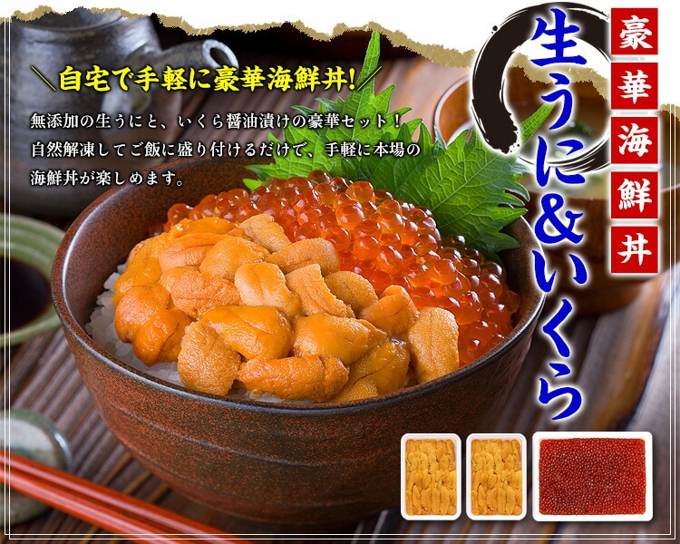 | ◆無添加生ウニ100g×2P <原材料>ウニ(チリ産) ◆イクラ醤油漬け200g <原材料>鱒の卵(ロシア産)、しょうゆ、粉末水飴、発酵調味料、みりん、砂糖、鰹節エキス、調味料(アミノ酸)、(原材料の一部に小麦、大豆、イクラを含む) |