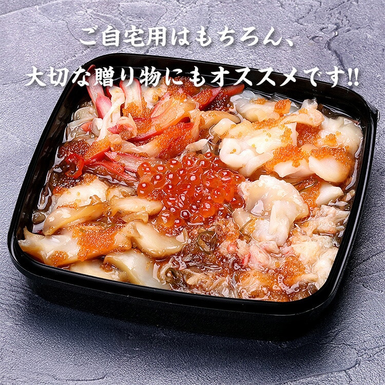 北海道・オホーツク海の食材を中心に10種類の具材を絶妙なバランスで作り上げた豪華な海鮮丼です。北海道南茅部昆布だしがきいた醤油ベースの松前漬けに、ホタテ貝、アワビ、ズワイガニ、イクラなどを贅沢にトッピングしています。すべての食材を確かな目で厳選し、一つ一つ手作業で作り上げた逸品。ご自宅用はもちろん、大切な贈り物にもオススメです。 |