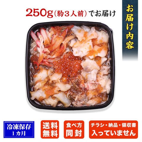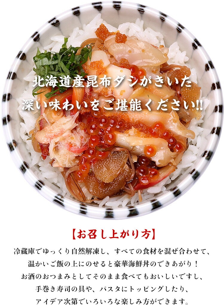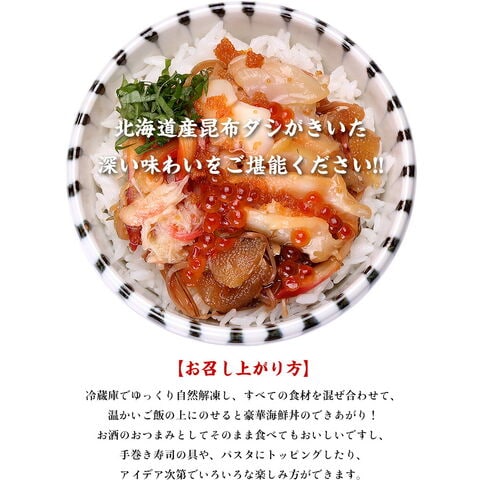 冷蔵庫でゆっくりと自然解凍して、すべての食材を混ぜ合わせてお召し上がりください。温かいご飯の上にのせて豪華海鮮丼として、又はお酒のおつまみとしてそのまま食べてもおいしいです。手巻き寿司の具や、パスタにトッピングしたり、アイデア次第でいろいろな楽しみ方ができます。 |