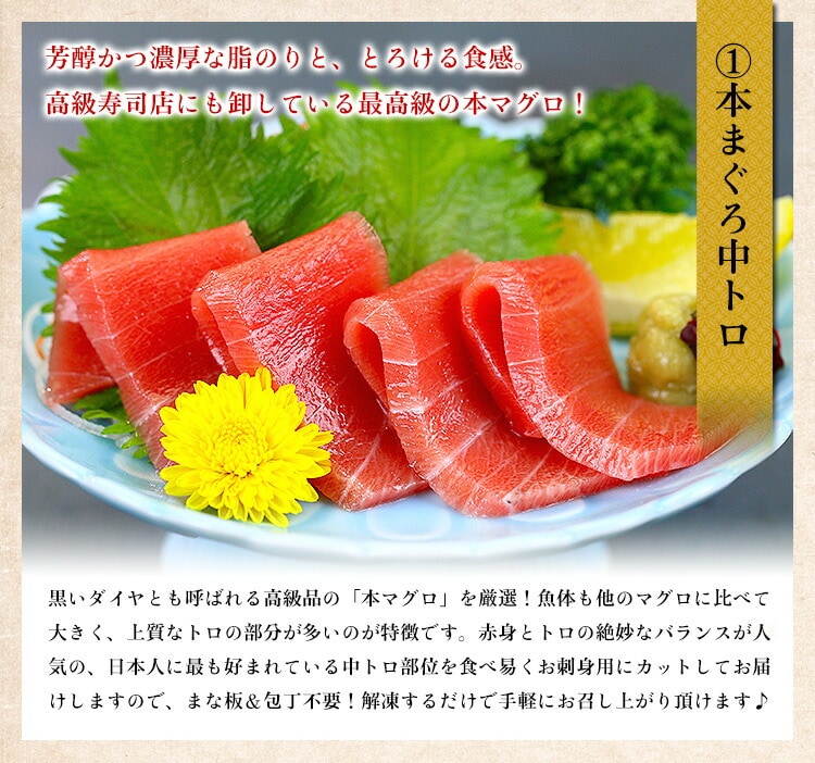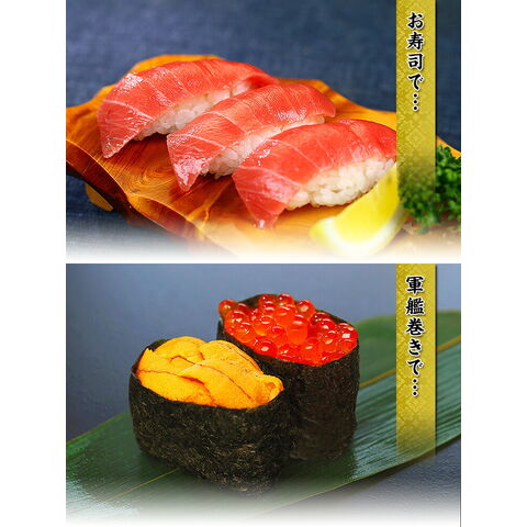 本日は、解凍してご飯にのせるだけの最高級本まぐろ入り海鮮5種セットをご紹介します!まず1品目は、黒いダイヤとも呼ばれる高級品の本マグロ中トロを食べ易く刺身用にスライス!芳醇かつ濃厚な脂のりと、とろける食感をご堪能できます。続いて2品目は、高品質な鱒いくらを原料に製造したこだわりのイクラ醤油漬け!プチプチとはじけて皮残りもなく、特有の生臭さもゼロ。いくら嫌いの人も虜になってしまうくらい美味しい極上品です。そして3品目は、ミョウバン不使用の無添加生ウニ!海産資源豊富なチリ産の新鮮な生ウニを、無添加ブランチ製法により美味しさそのまま急速冷凍しました。そして4品目は、北海道産の生ホタテ貝柱!極寒のオホーツク海で育った極上のホタテはとろっと甘く、繊維もしっかり。お刺身には最高の逸品です。 そして5品目は、とろける極上ネギトロ!「つぶつぶ感」と「ねっとり感」の絶妙なバランスにこだわり、マイルドなネギトロに加工しました。以上の海鮮5品すべて包丁&まな板不要!自然解凍するだけで手軽に本場の海鮮丼をご堪能できます。ご家族揃って満喫するもよし、大切な人への贈り物にも、店長@田辺が自信を持ってお勧めします。 |