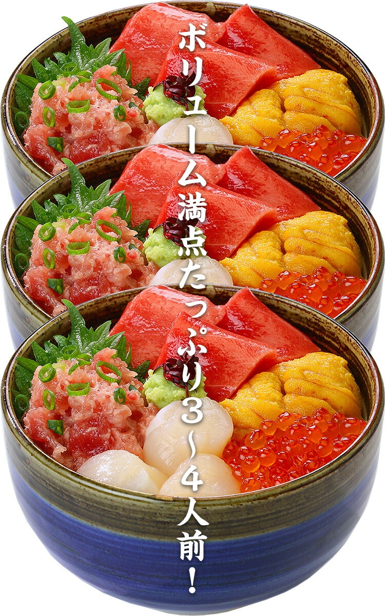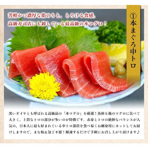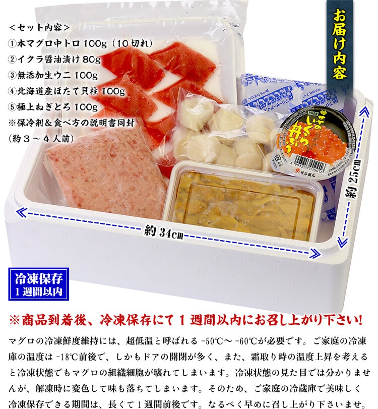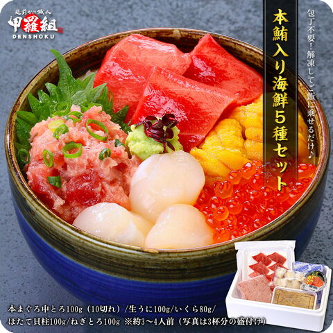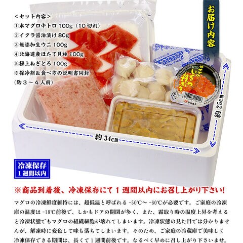 包丁不要!高級本まぐろ入り豪華海鮮5種セット(本まぐろ中とろ100g/10切れ、無添加生うに100g、いくら醤油漬け80g、ほたて貝柱100g、極上ねぎとろ100g)