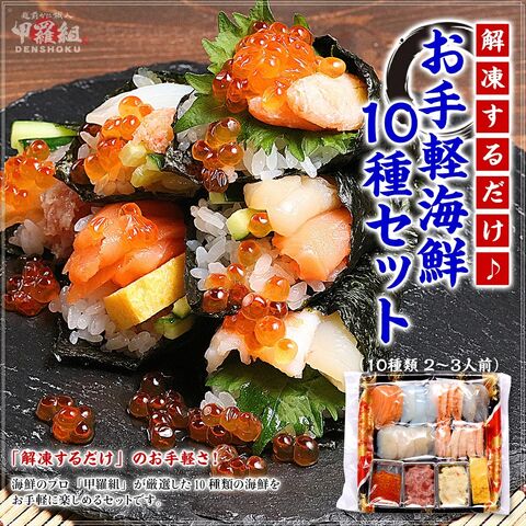 ★飲食店だと5,000円以上の海鮮セットを送料無料でお得に! ★大人から子供まで幅広く楽しめる甲羅組厳選の海鮮セット! ★海鮮丼、手巻き寿司、握り寿司等、ご家庭でお手軽に海鮮パーティー♪ 海鮮のプロ、甲羅組厳選のお手軽海鮮セットをご紹介! 今回ご紹介する海鮮セットは、甲羅組が厳選した10種類の海鮮を解凍するだけでお手軽に楽しめるセットです。 三陸で水揚げされた天然ヒラメをはじめ、南米チリの豊かな海で育ったトラウトサーモン、市場になかなか出回らない幻のかに「まるずわいがに」等の本格海鮮から、酸味と甘みが絶妙にマッチした海鮮サラダ、お子様が大好きな甘い味付け玉子まで、様々な角度から楽しめる海鮮をぎゅっと詰め込みました♪ 海鮮丼はもちろん、手巻き寿司や握り寿司、お刺身など楽しみ方も様々で、ご自宅でバラエティ豊かな海鮮を簡単にご堪能いただけます。 海鮮丼にして飲食店だと5,000円を超える海鮮セットが、送料無料でお得・お手軽に楽しめる甲羅組のお手軽海鮮セットをぜひご賞味ください! |