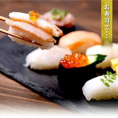 【1】天然ひらめ(三陸産) <3枚入り> 三陸で水揚げされた「天然」のひらめ!コリコリとした食感と、淡白ながらも深い旨味が凝縮された上品な味わいです。 【2】まるずわいがに <6本入り> なかなか市場に出回らない幻の蟹。弾力のある食感と甘み・風味が味わい深い一品です。 【3】アトランティックサーモン <3枚入り> ノルウェーより生鮮空輸で「生」の原料を工場へ直納し、加工した一品。 鮮度抜群だから脂のりと身の色も鮮やかです。 【4】ほたて貝(北海道産) <6枚入り> 世界屈指の好漁場、本場北海道産のホタテ。特殊な凍結方法で甘味を逃がさずに製造し、しっかりとした食べ応えのある身質です。 【5】スルメイカ <3枚入り> ハズレのない「イカといえば」の王道“するめいか”を使用。旨味と甘味が詰まった、愛される定番の 一品です。 【6】醤油鱒いくら <15g入り> 皮残りが少なく、鮭の卵より甘味が強く濃厚な「鱒いくら」を厳選。醤油で丁寧に味付けした一品です。 【7】たたき鮪 <25g入り> 安心・安全の国内加工品。日本人に愛されるマグロの程よい甘さと食感が味わえる、絶対に外せない定番の一品です。 【8】寿司えび <3枚入り> エビ本来の甘味と歯ごたえはもちろん、鮮やかな色合いも魅力の定番品。お子様も大好きな一品です。 【9】海鮮サラダ <25g入り> イカ・ホッキ貝・ホタテ(ヒモ)・数の子をマヨネーズ・調味料と混ぜ合わせた海鮮サラダ。 4種の具材が織りなす食感と、酸味・甘みが絶妙にマッチした味わいがクセになる一品です。 【10】味付玉子 <3本入り> 甘い味付けなのに飽きがこない…。お子様から大人まで長く愛され続ける、寿司ネタの定番です。 <原材料> ほたて貝(北海道産)、まるずわいがに、味付玉子(鶏卵、砂糖、かつおだし、醤油、みりん、食塩、醸造酢、植物油/加工澱粉)、海鮮サラダ(アカイカ、半固体状ドレッシング、カナダホッキガイ、ホタテ貝ヒモ、数の子、アミノ酸液調味料、砂糖、還元水飴、発酵調味料、かつお節エキス、醤油/増粘剤(加工澱粉、増粘多糖類)、調味料(アミノ酸等)、香辛料抽出物、pH調整剤、クチナシ色素)、魚介類加工品(鮪、ショートニング、鮪油、食塩/pH調整剤、調味料(有機酸)、トレハロース、膨張剤、酸化防止剤(V.C))、アトランティックサーモン、スルメイカ、ひらめ、寿司エビ(バナメイエビ、食塩)、醤油漬いくら(鱒卵、醤油、オリゴ糖、還元水飴、食塩、鰹節エキス、米発酵調味料、みりん/調味料(アミノ酸等)、pH調整剤)、(一部にえび・かに・小麦・卵・乳成分・さけ・いか・大豆・いくら・りんご・ゼラチン・さばを含む) |