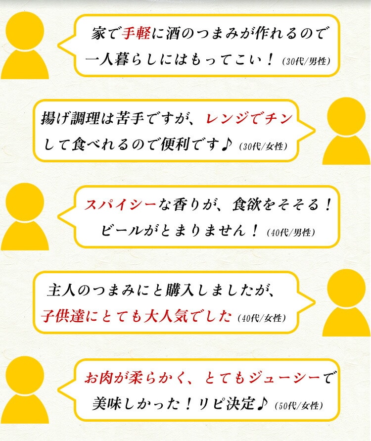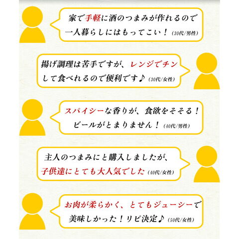 原材料:鶏肉(手羽先)、醤油、でん粉、砂糖、食塩、香辛料、加工でん粉、ポリリン酸Na、調味料(アミノ酸)、着色料(パプリカ色素)、(原材料の一部に小麦、大豆を含む) |