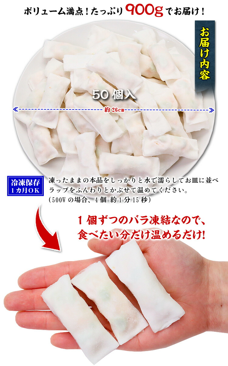 | 冷凍春巻900g(50個) ※原産国:ベトナム <原材料>えび、枝豆(大豆)、大豆油、たけのこ、でん粉、砂糖、ごま油、食塩、白胡椒、皮(でん粉(小麦を含む)、大豆油、砂糖、食塩)/調味料(アミノ酸)、ポリリン酸Na、pH調整剤 |