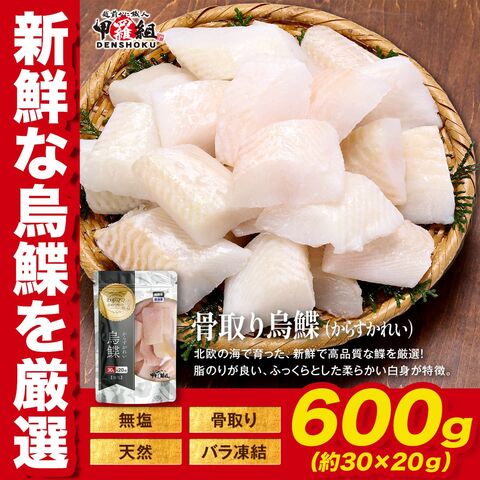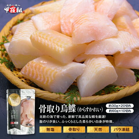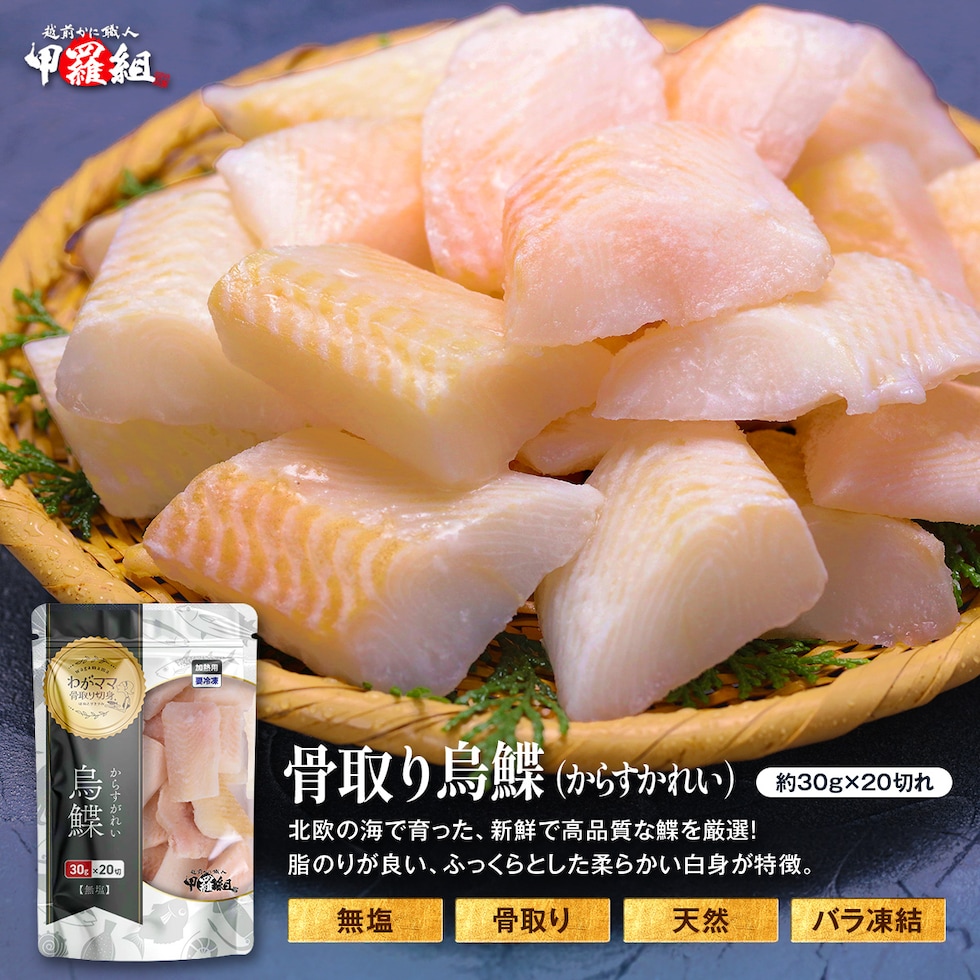 | 無塩&骨取りカラスガレイの切身(約30g×20切れ) 原材料:カラスガレイ(ノルウェー産、デンマーク産もしくはアイスランド産) |