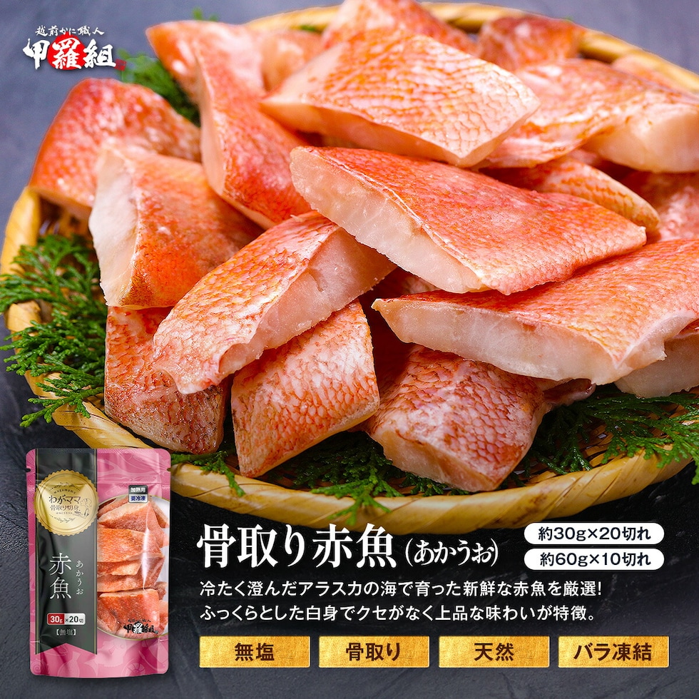 | 無塩&骨取り赤魚の切身(約30g×20切れ/約60g×10切れ) 原材料:赤魚(アメリカ産)/酸化防止剤(V.C)) |