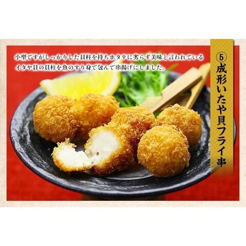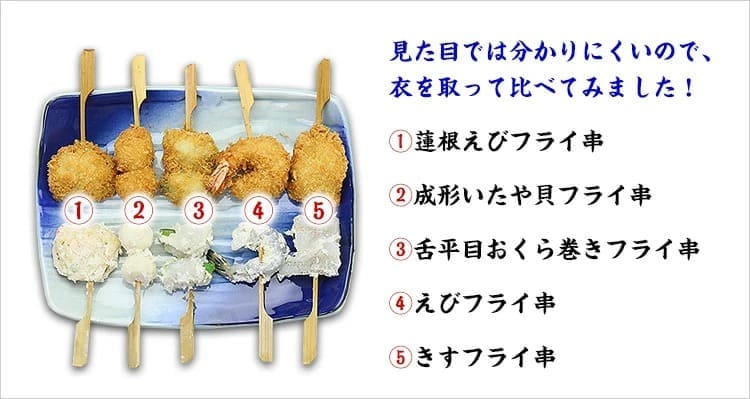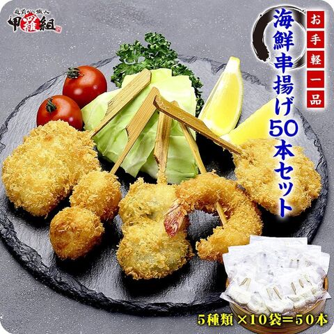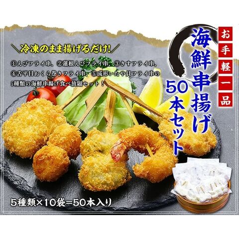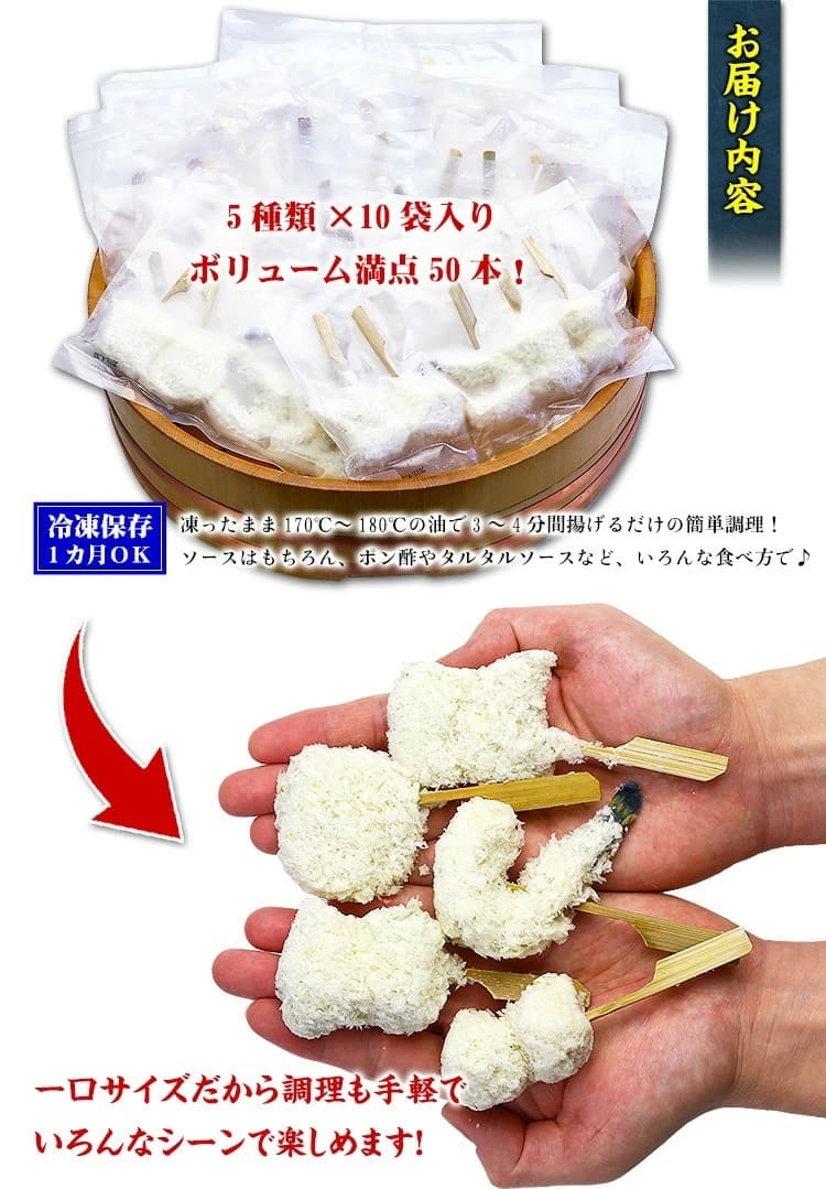 えびフライ串、蓮根えびフライ串、きすフライ串、舌平目おくら巻きフライ串、成形いたや貝フライ串の5種×10袋⇒大ボリューム50本入りの海鮮串揚げセットです。 |