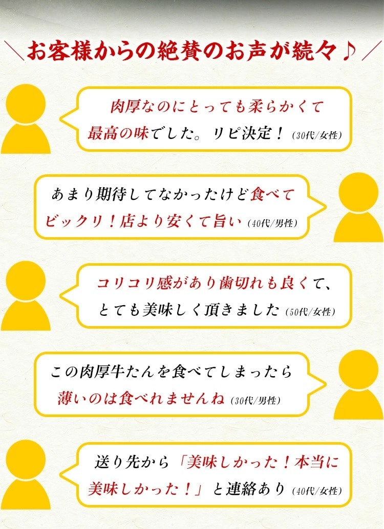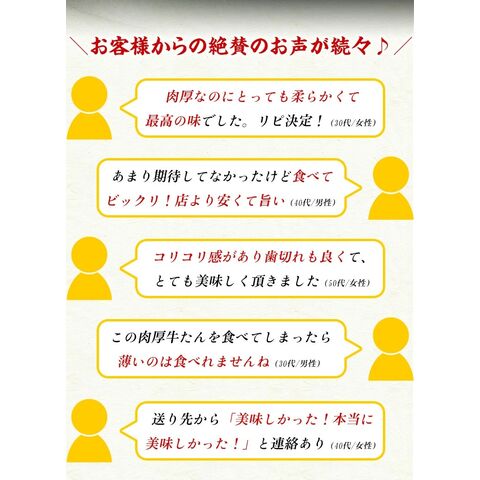 | ◎肉質が柔らかく肉汁もたっぷりな穀物飼育の牛たん! ◎柔らかい上級部位「たん元」「たん中」厳選使用! ◎厚切り15mmカットで食べ応え抜群! ◎ステーキの他にも、牛たん丼、牛たんポトフ、牛たんシチュー、いろんな食べ方で! ◎美容のビタミンB群が豊富!ヘルシーなお肉です。 一般的な焼肉屋さんで出てくる牛たんは1mm~2mm程度ですが、今回お届けする牛たんは、食べ応え抜群の厚切り15mmカットです。「そんなに分厚いとかたくて噛み切れないのでは?」ご安心ください♪今回お届けする牛たんは、肉質が柔らかく肉汁もたっぷりな穀物肥育の牛たんを厳選!しかも、上級部位「たん元」「たん中」を使用しています。専門店の味をご家庭で存分にお楽しみください! |