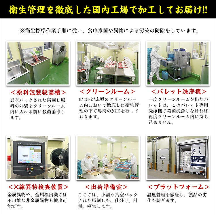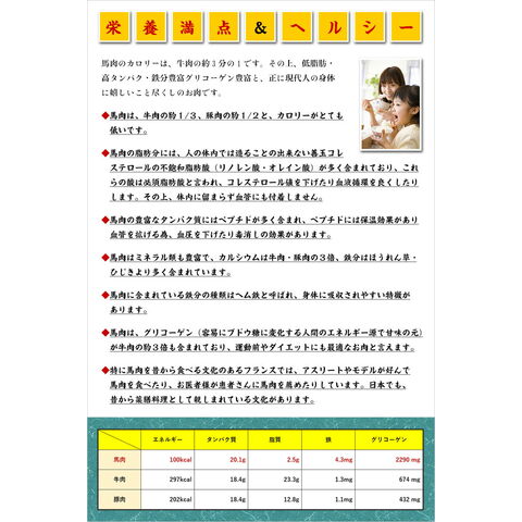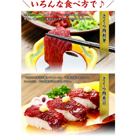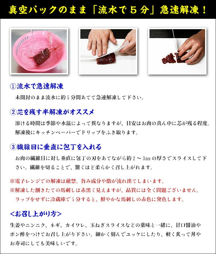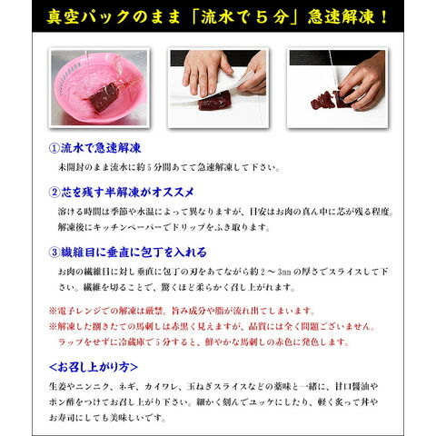 ◎もっちりした食感と上品な旨みがあるヘルシー上赤身! ◎安心安全の馬肉を国内工場で加工し急速冷凍! ◎一人前50gずつの個別真空パック包装だから使い易い! ◎馬肉のカロリーは牛肉の1/3で低脂肪&高たんぱく! ◎グリコーゲンや鉄分・カルシウムなどのミネラルたっぷり! 馬刺しを食べたことがないお客様から「馬肉って食感がかたいんじゃない?」とか「味も独特のクセがあるんじゃない?」というお声を頂戴することがありますが、それはまったくの誤解です。馬肉の中でも上質な部分を厳選した「馬刺し上赤身」は、もっちりした食感と口の中に入れたとたんに濃厚な甘みが広がります。脂肪分が少なく低カロリーで、しかもグリコーゲンや鉄分などの栄養も満点。なので、ダイエット中の方やお子さまにもぴったり!特に赤身はご年配の方にも人気の部位で、「脂っこい肉はダメだけど、馬刺しの赤身は毎日食べても飽きない」と、リピーターさんも実は多いんですよ♪一人前の50gずつにカットし鮮度そのまま急速冷凍してありますので、冷凍庫に保存しておけば、いつでも手軽に新鮮な馬刺しが楽しめます。 |