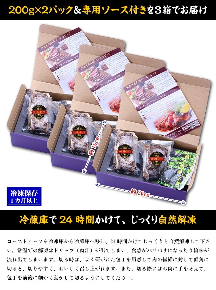 ローストビーフを冷凍庫から冷蔵庫へ移し、24時間かけてじっくりと自然解凍して下さい。常温での解凍はドリップ(肉汁)が出てしまい、食感がパサパサになったり旨味が流れ出てしまいます。切る時は、よく研がれた包丁を用意して肉の繊維に対して直角に切ると、切りやすく、おいしく召し上がれます。また、切る際にはお肉に手をそえて、包丁を前後に細かく動かして切るようにしてください。 |