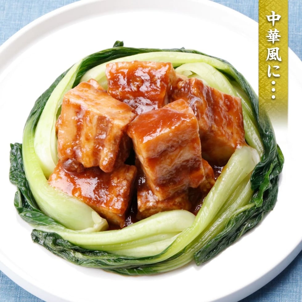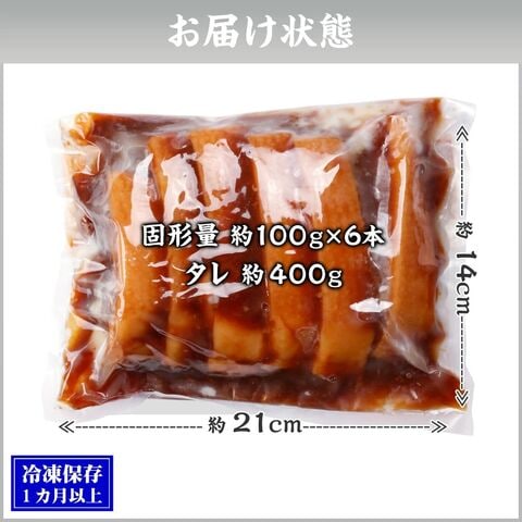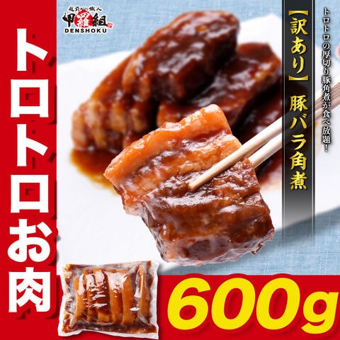 | 豚バラ角煮600g(固形量約100g×6本・タレ400g) 原材料:豚肉(スペイン産)、醤油、ザラメ糖、みりん/増粘剤(加工でんぷん)、ph調整剤、カラメル色素、甘味料(サッカリンNa)、保存料(酒精、ビタミンB1)、(一部に小麦・乳成分・大豆・豚肉を含む) ※固形量には脂身を含みますが、解凍の仕方によっては脂身が崩れてしまったり、袋から取り出す際に脂身が剥がれてしまう場合があります。 |