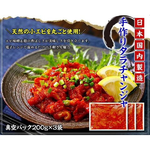 | たらチャンジャ200g×3袋 原産国:日本 ≪原材料≫真鱈の胃袋(ノルウェー・アメリカ産)、唐辛子、ニンニク、生姜、コーンスターチ、いりこだしの素、牛肉味だしの素、胡麻油、発酵調味料、みりん、ごま、塩、砂糖、調味料(アミノ酸等)、酸味料、香料、香辛料抽出物(一部に小麦、乳成分、えびを含む) |