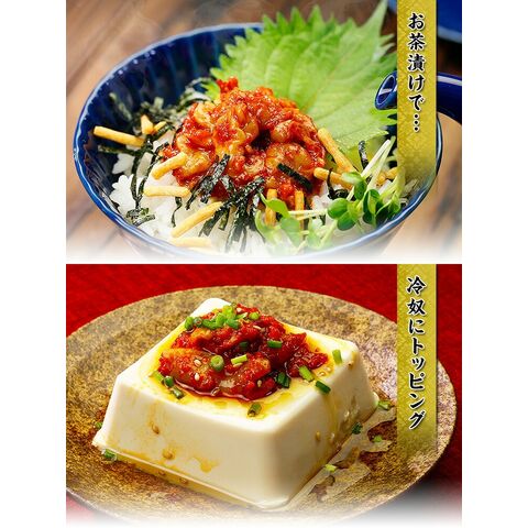 真空パックのまま流水で急速解凍し、お召し上がりください。辛みが強い場合はゴマ油をかけたり、クリームチーズと一緒にお召し上がりください。 おつまみ、ご飯のお供、おにぎりの具、冷奴にトッピングしても美味しです。 |