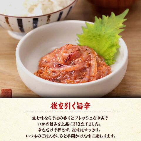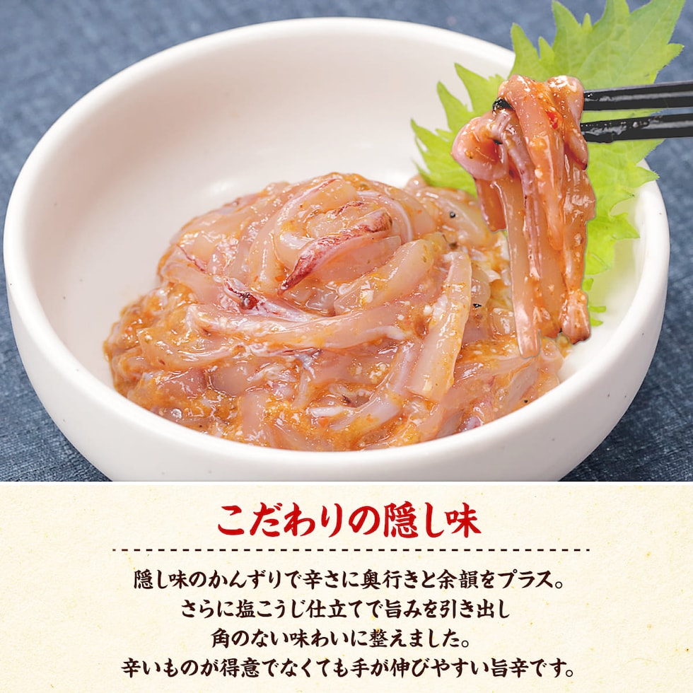 いかの旨みを、生七味唐辛子で引き立てた「いか生七味」。粉末の七味とは違う爽やかな辛味と、ふわっと広がる香りが食欲をそそります。