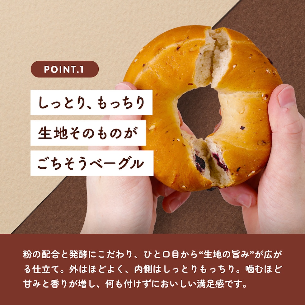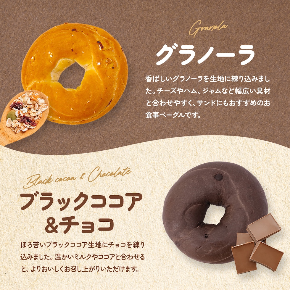 香ばしいグラノーラを練り込みました。チーズやハム、ジャムなどいろいろなものと相性のよい、サンドにおすすめのお食事ベーグルです。