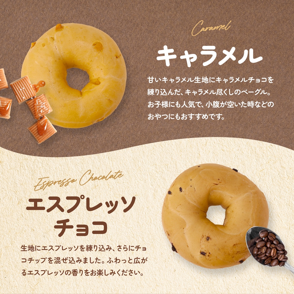 甘いキャラメル生地にキャラメルチョコを練り込んだ、“ザ・キャラメル”ベーグル。お子様にも人気のおやつベーグルです。