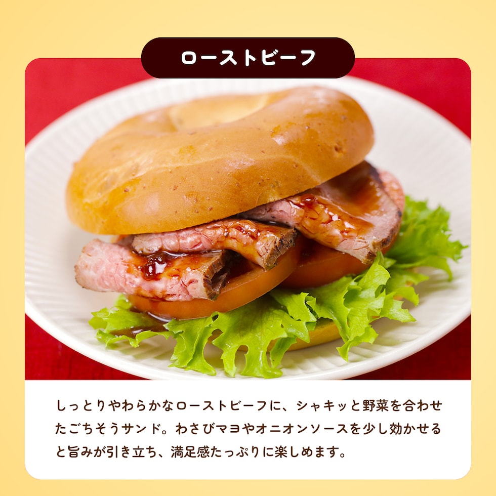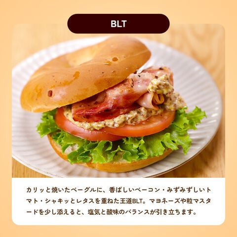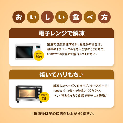 室温で自然解凍するか、お急ぎの場合は、冷凍のままベーグルをさっと水にくぐらせて、600Wで30秒温めて解凍してください。解凍したベーグルをオーブントースターで1000Wで1.5分~2分焼いてください。パリパリ&もっちり食感で美味しさ倍増♪