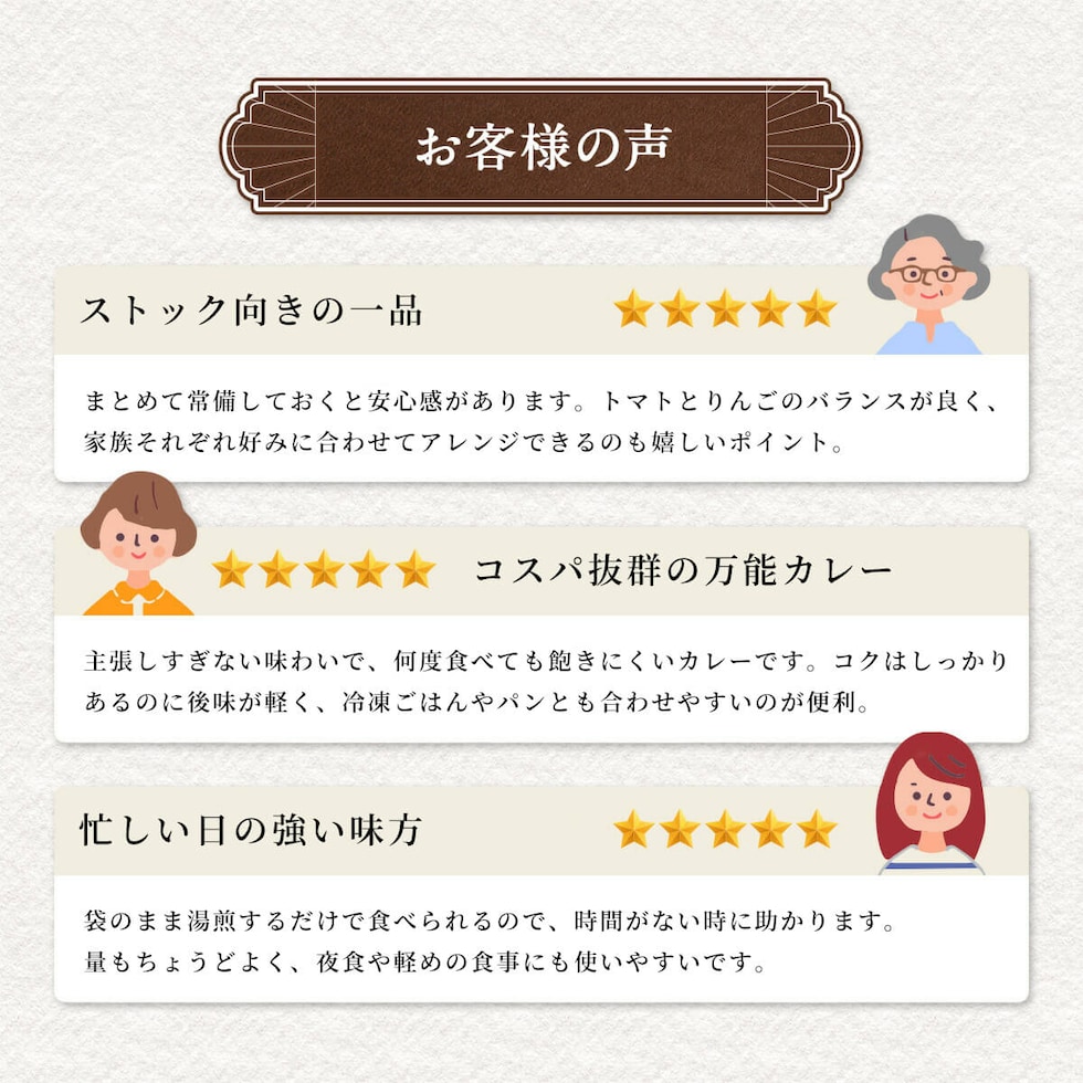 ◎ お子さまや女性の方でも食べやすい1袋180gサイズ ◎ ココナッツミルク・チャツネ・ミルポアペーストを使用し、奥行きのあるコクを実現 ◎ トマトとりんごの酸味を活かした、飽きのこないビーフカレー ◎ クセがなく、幅広い年代・シーンに対応しやすい味設計 ◎ ベース使いしやすく、トッピングやアレンジ自在 ◎ 温めるだけでの簡単調理 ココナッツミルク、チャツネ、ミルポアペーストを使用し、じっくり煮込んだような深みのあるコクを引き出したビーフカレー。 トマトとりんごのほどよい酸味を活かした、クセのないオーソドックスな味わいで、どなたにも親しみやすく仕上げました。 1袋180gとお子さんや女性の方でも食べやすいサイズで家族みんなでお楽しみいただけます。 そのままはもちろん、トッピングやアレンジのベースとしても使いやすい一品です。 |