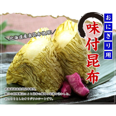 | 味付昆布(おにぎり用シート)10枚×10袋 <原材料>昆布、醸造酢、鰹節エキス、砂糖、醤油(小麦を含む)、たん白加水分解物(大豆を含む)、味醂、食塩、ゼラチン、調味料(アミノ酸等)、香辛料抽出物、甘味料(アセスルファムK) |