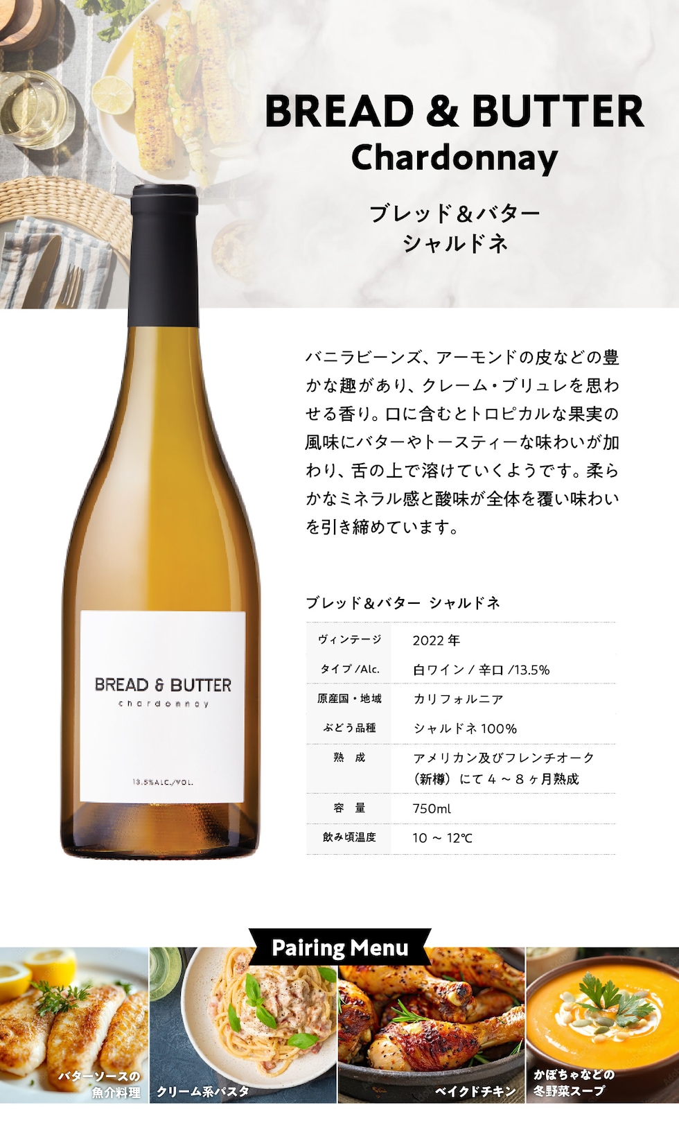 ブレッド&バター シャルドネ カリフォルニア 白ワイン 辛口 フルボディ Bread&Butter Chardonnay ブレッド&バター シャルドネ 樽香 家飲み 高級ワイン ギフト 白ワイン 定番ワイン ワイン 贈り物 年末年始 お歳暮 冬ギフト クリスマス