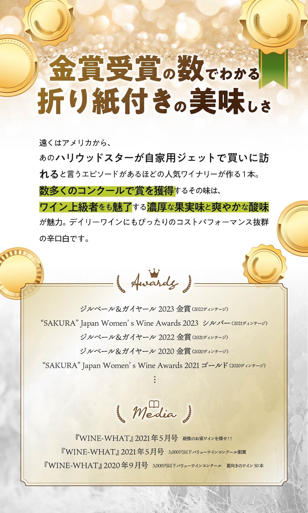 ・ジルベール&ガイヤール 2023金賞[VT:2022] ・"SAKURA" Japan Women's Wine Awards 2023シルバー[VT:2021] ・ジルベール&ガイヤール 2022金賞[VT:2021] ・ジルベール&ガイヤール 2020金賞[VT:2020] ・"SAKURA" Japan Women's Wine Awards 2021ゴールド[VT:2020] |