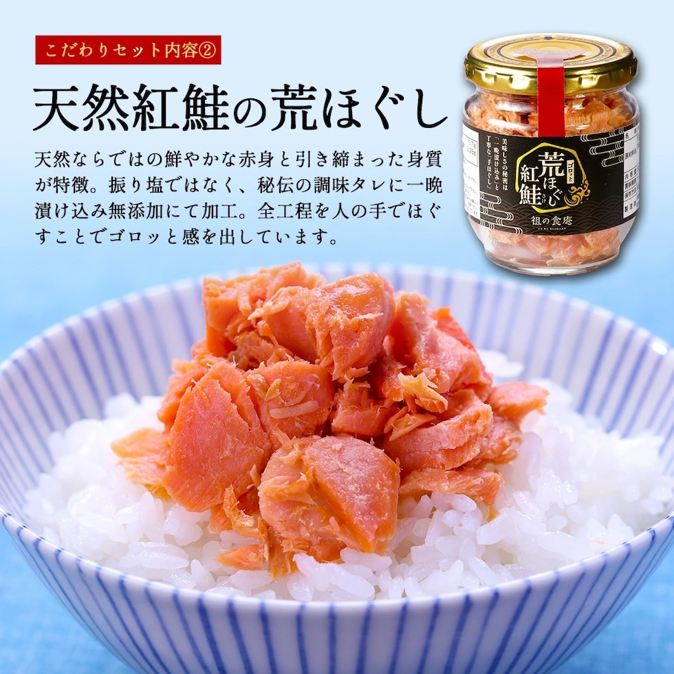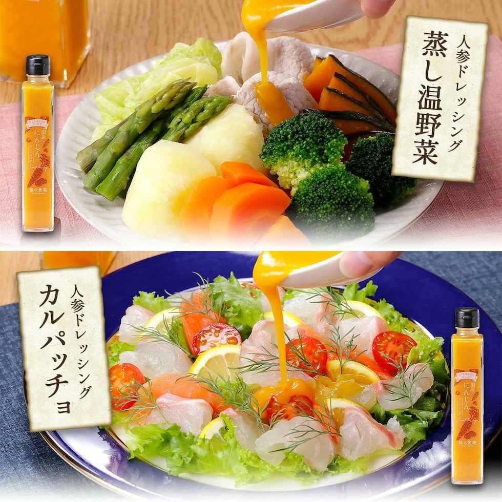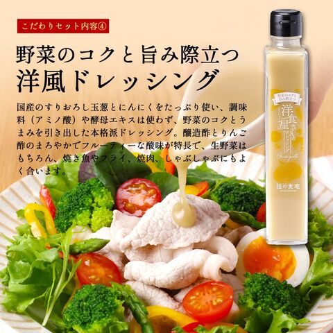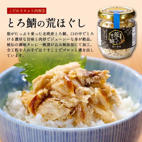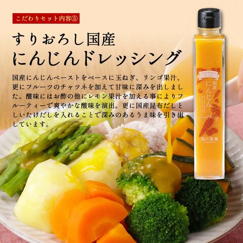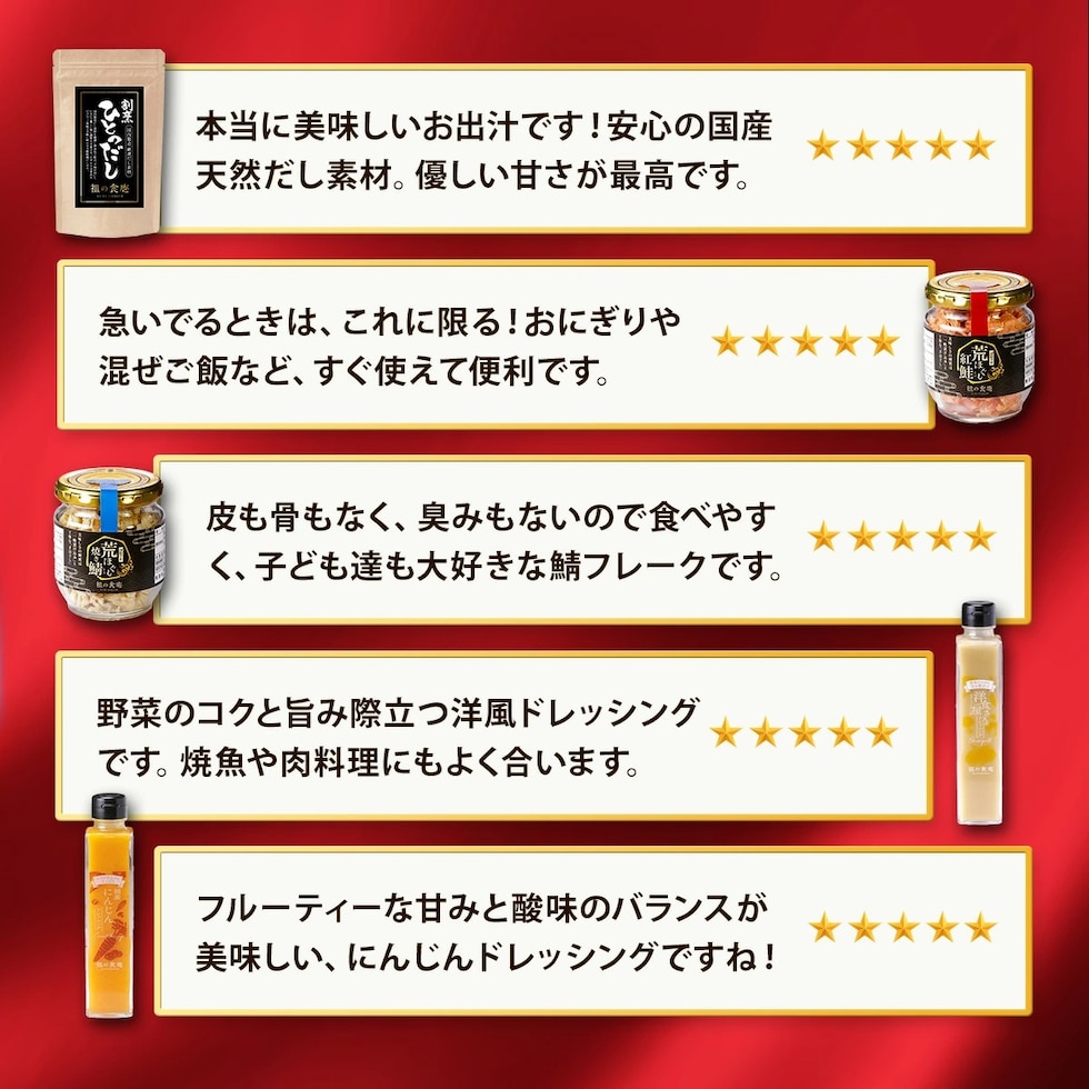 | 【1】割烹ひとつだし この「だし」ひとつで、どんな料理も美味しくなる!国内で製造しただし素材を35%以上も配合し、豊かな香りを実現した、手軽に本格的なだしが取れるだしパックです。塩や砂糖を配合し、ご家庭では難しいだしの味も調えてありますので、ティーバッグを3分煮出すだけで、ご家庭で簡単に料亭の味が楽しめます。お味噌汁、うどん、炊き込みご飯、煮物…和風料理全般にご利用頂けます。 【2】天然紅鮭の荒ほぐし 天然ならではの鮮やかな赤身と引き締まった身質が特徴です。振り塩やシーズニングではなく、秘伝の調味タレに一晩漬け込み無添加にて加工。また、全工程を人の手でほぐすことでゴロッと感を出しています。 【3】天然とろ鯖の荒ほぐし 脂がたっぷり乗った北欧産とろ鯖。口の中でとろける濃厚な旨味と、肉厚でジューシーな身が絶品です。振り塩やシーズニングではなく、秘伝の調味タレに一晩漬け込み無添加にて加工。また、全工程を人の手でほぐすことでゴロッと感を出しています。 【4】野菜のコクと旨み際立つ洋風ドレッシング 国産のすりおろし玉葱とニンニクをたっぷりと使い、調味料(アミノ酸)や酵母エキス等は使わずに、野菜のコクとうまみをしっかり引き出した本格派のドレッシングです。醸造酢の他にリンゴ酢も使用する事でまろやかでフルーティーな酸味で、野菜嫌いのお子様にもオススメ!生野菜はもちろん、焼き魚やフライ、焼肉、しゃぶしゃぶなど、なんでも合う万能ドレッシングです。 【5】すりおろし国産にんじんドレッシング 国産にんじんペーストをベースに玉ねぎ、リンゴ果汁、更にフルーツのチャツネを加えて甘味に深みを出しました。酸味にはお酢の他にレモン果汁を加える事によりフルーティーで爽やかな酸味を演出。更に国産昆布だしとしいたけだしを入れることで深みのあるうま味を引き出しています。 |