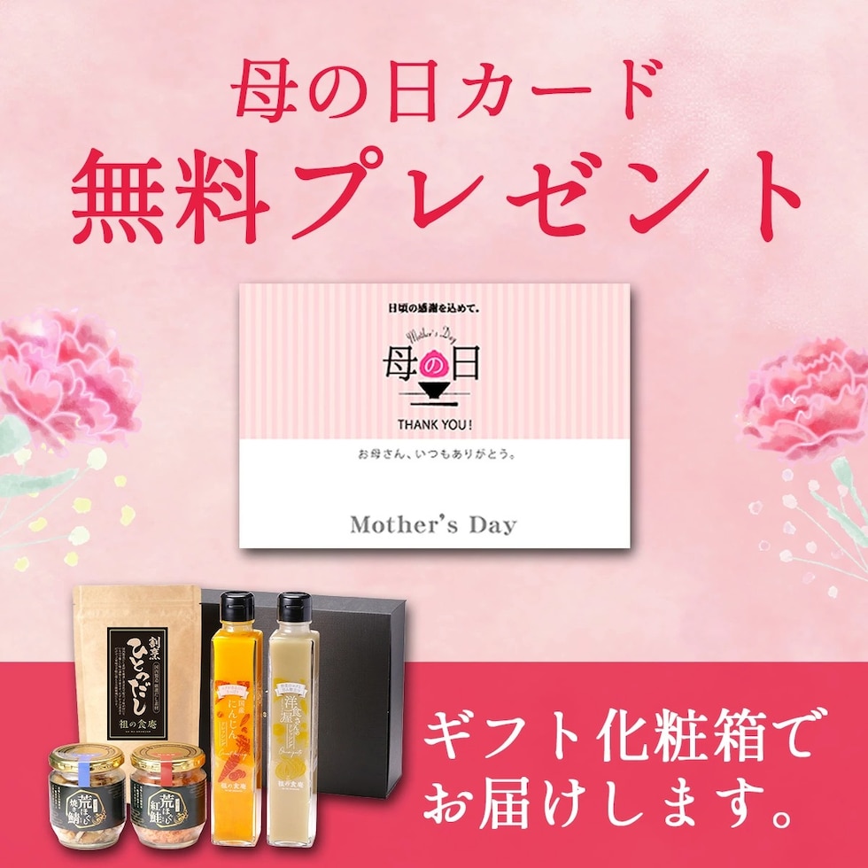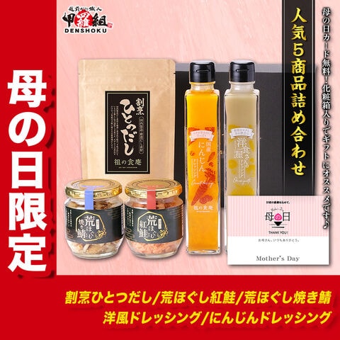 【母の日カード付き】母の日 ギフト プレゼント 人気5商品詰め合わせ(割烹ひとつだし+紅鮭の荒ほぐし+とろ鯖の荒ほぐし+洋食屋さんのドレッシング+国産にんじんドレッシング)