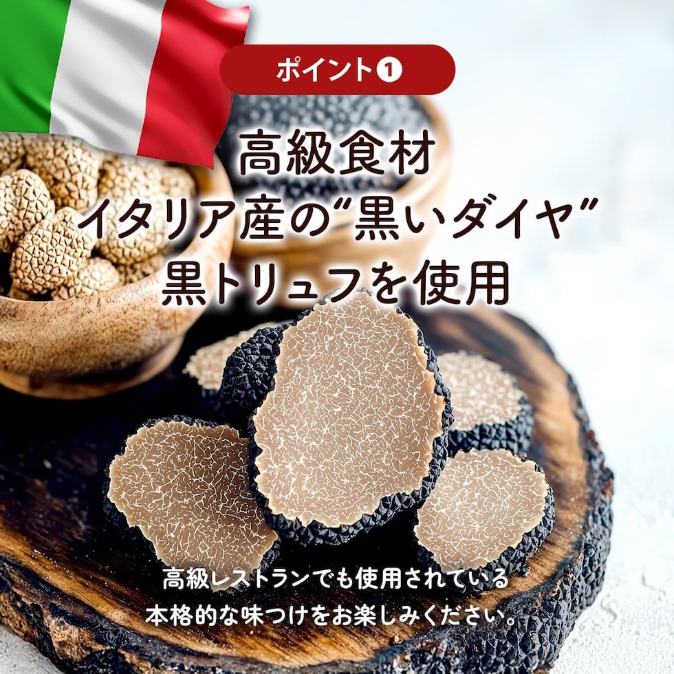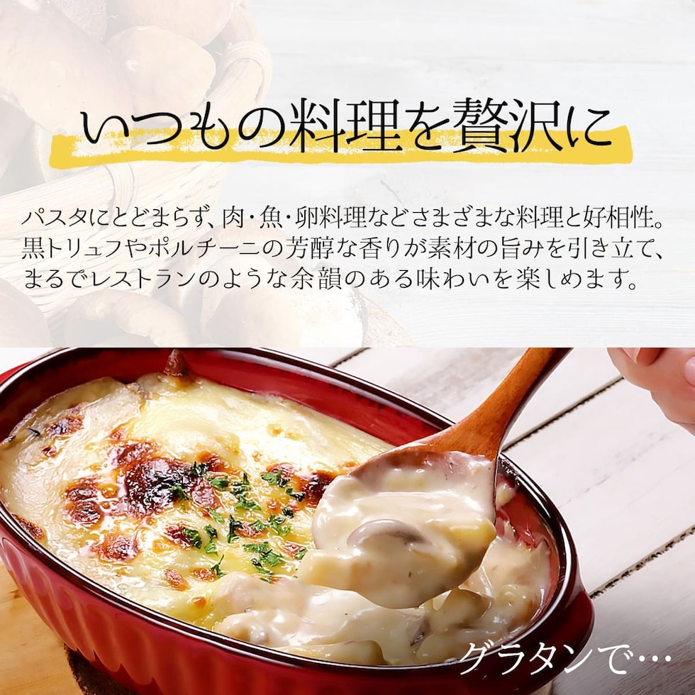 【トリュフクリームソース】 トリュフクリームソース 100g <原材料>食用ひまわり油(イタリア製造)、牛乳、黒トリュフ入りキノコペースト、チキンブイヨン(小麦・牛肉・大豆・ゼラチンを含む)、バター、食塩、乳等を主要原料とする食品、米粉/調味料(アミノ酸等)、増粘剤(加工デンプン、増粘多糖類)、乳化剤、酸化防止剤(V.E)メタリン酸Na、トレハロース、香料、酸味料 【ポルチーニクリームソース】 ポルチーニクリームソース 100g <原材料>食用ひまわり油(イタリア製造)、牛乳、ポルチーニ、チキンブイヨン(小麦・牛肉・大豆・ゼラチンを含む)、バター、食塩、乳等を主要原料とする食品、米粉/調味料(アミノ酸等)、増粘剤(加工デンプン、増粘多糖類)、乳化剤、酸化防止剤(V.E)、トレハロース、メタリン酸Na、酸味料、香料 |