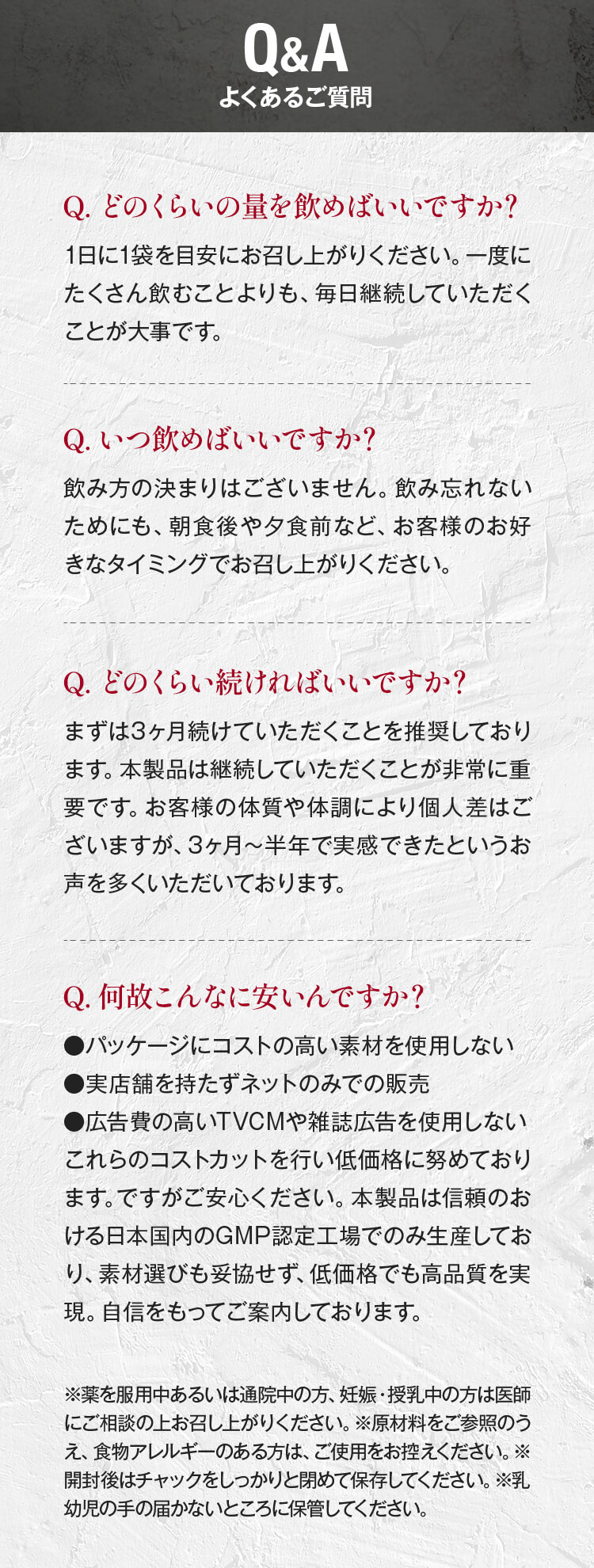 1日当たり1包(3g)を目安に150mlの水などに溶かしてお召し上がりください。 ※開封後は開封口をしっかり閉めて冷暗所に保管してください。 ※薬を服用中あるいは通院中の方、妊娠・授乳中の方は、医師にご相談の上お召し上がりください。 ※原材料をご参照の上、食物アレルギーのある方は、ご使用を控えてください。 ※乳幼児の手の届かないところに保管してください。また、乳幼児やお子様へのご使用は控えてください。 ※原料由来により、色調に変化が生じる場合がありますが、品質に問題はございません。 |