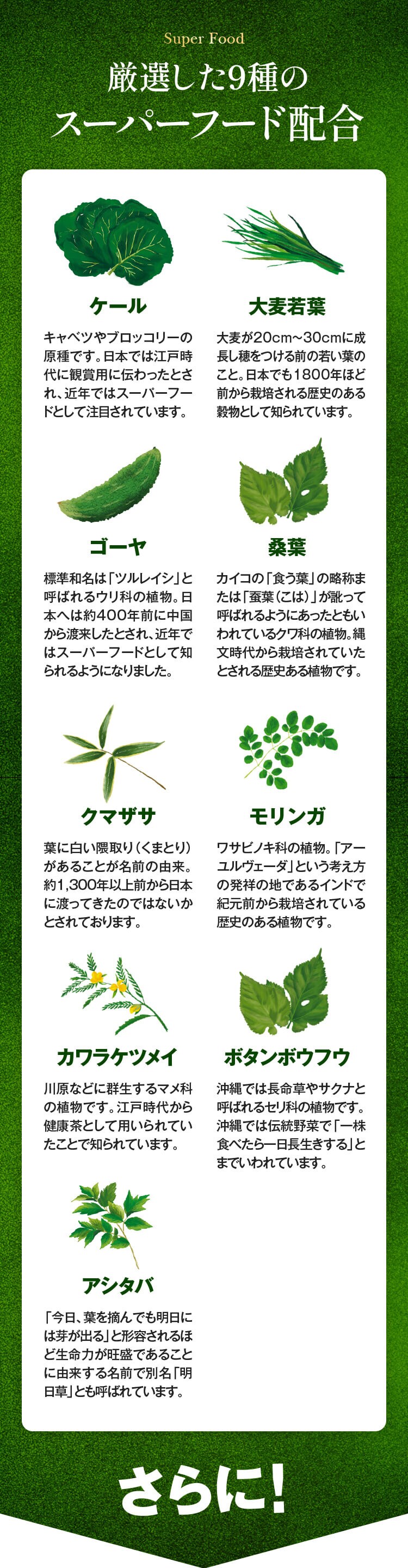 ◎厳選した9つのスーパーフード配合! (ケール、大麦若葉、ゴーヤ、桑葉、クマザサ、モリンガ、カワラケツメイ、ボタンボウフウ、アシタバ) ◎野菜のビタミン・ミネラルや美容サポート成分を一度に摂れる! ◎健康サポート成分が豊富! (プラセンタ、イソマルトオリゴ糖、水溶性食物繊維、乳酸菌) ◎GMP認定工場のみで生産してます! 普段の食事だけでは野菜摂取量が全く足りない、野菜をもっと簡単に摂取したい。そんな日々野菜不足を感じている方にオススメ!一度この超本格派青汁をお試しください。9つの野菜の恵みを贅沢に配合しており、中でも近年スーパーフードとして注目されている「ケール」はビタミン・ミネラル食物繊維など現代人に不足しがちな栄養素を豊富に含んでおります。仕事の合間や忙しい朝、夕食前など飲むタイミングはお客様のお好きなタイミングでお召し上がりください。まずは3ヶ月程続けていただくことを推奨しております。 |