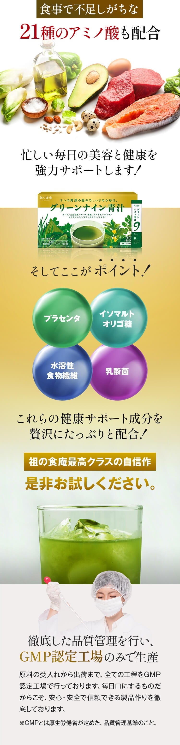 大麦若葉含有加工食品 90g(3g×30包) <原材料>大麦若葉末(国内製造)、デキストリン、有機ケール末、抹茶、ゴーヤ末、豚プラセンタエキス末、難消化性デキストリン、イソマルトオリゴ糖、L-オルニチン塩酸塩、L-シトルリン、アシタバ末、桑葉末、クマザサ末、モリンガ末、カワラケツメイ末、ボタンボウフウ末、乳酸菌末(殺菌)/トレハロース、L-アラニン、L-アルギニン、L-アスパラギン酸ナトリウム、L-シスチン、L-グルタミン、L-グルタミン酸、L-ヒスチジン、L-リジン塩酸塩、L-メチオニン、L-フェニルアラニン、L-プロリン、L-テアニン、L-トレオニン、L-トリプトファン、L-チロシン、グリシン、L-ロイシン、L-バリン、L-イソロイシン、(一部に乳成分、豚肉を含む) |
