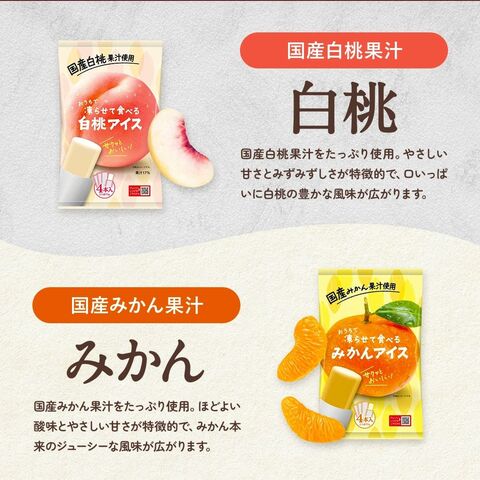 ◎常温で保管ができる!冷凍庫の容量を圧迫しない! ◎凍らせるとシャーベットのようなサクシャリ食感と爽快感が楽しめる! ◎一口アイスやスムージーなどアレンジ自在! 「おうちで凍らせて食べる」の名前通り、おうちに帰ってから凍らせて食べるアイスです。食べたい分だけ、食べたい時に冷凍庫で凍らせてお召し上がり下さい。※冷凍庫に入れてからの凍結時間の目安:約8時間 |