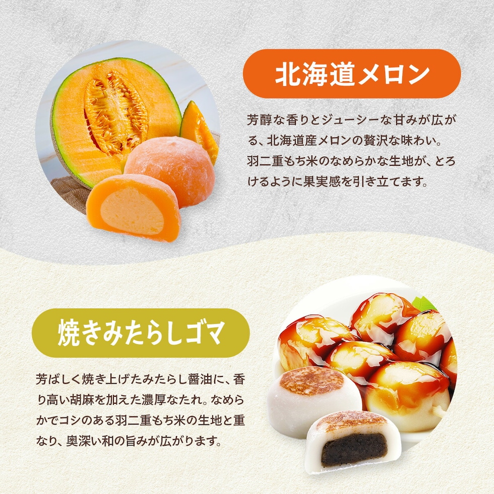 | 【1】北海道メロン大福 <原材料>北海道メロンフラワーペースト(国内製造)、もち粉、砂糖、でん粉、もち米(滋賀県産)/トレハロース、加工でん粉、グリシン、ソルビトール、酸味料、pH調整剤、香料、乳化剤、酵素、保存料(ポリリジン)、着色料(紅麹、カロテン、赤3、黄5)、(一部に卵・乳成分・大豆を含む) 【2】焼き餅みたらしごま大福 <原材料>黒ごま醤油餡(国内製造)、米粉、砂糖、もち粉、でん粉/トレハロース、ソルビトール、グリシン、pH調整剤、酵素、保存料(ポリリジン)、乳化剤、(一部に小麦・乳成分・ごま・大豆を含む) 【3】クリームソーダ大福 <原材料>ソーダ餡(国内製造)、もち粉、砂糖、ホイップクリーム、でん粉、もち米(滋賀県産)、/トレハロース、ソルビトール、酸味料(クエン酸)、乳化剤、酵素、香料、グリシン、pH調整剤、保存料(ポリリジン)、着色料(青1、カロテン色素)、(一部に乳成分・大豆を含む) 【4】クリームチーズ大福 <原材料>クリームチーズフラワーペースト(国内製造)、もち粉、砂糖、でん粉、もち米(滋賀県産)/トレハロース、加工でん粉、ソルビトール、乳化剤、酵素、pH調整剤、グリシン、香料、保存料(ポリリジン)、着色料(赤3、黄4)、(一部に乳成分・小麦・卵・大豆を含む) 【5】栗きんとん大福 <原材料>栗餡(国内製造)、もち粉、砂糖、カット栗(砂糖漬)、もち米(滋賀県産)、でん粉/トレハロース、ソルビトール、乳化剤、酵素、グリシン、着色料(クチナシ黄色素)、香料、pH調整剤、酸化防止剤(V.C)、保存料(ポリリジン)、(一部に乳成分・大豆を含む) 【6】いちごミルク大福 <原材料>いちご餡(国内製造)、もち粉、砂糖、ホイップクリーム、でん粉、もち米(滋賀県産)/ソルビトール、トレハロース、乳化剤、酵素、香料、グリシン、酸味料(クエン酸)、pH調整剤、保存料(ポリリジン)、着色料(カロテン色素、赤102)、(一部に乳成分・大豆を含む) 【7】チョコ大福 <原材料>チョコレート餡(国内製造)、もち粉、砂糖、もち米(滋賀県産)、でん粉、ココアパウダー/トレハロース、着色料(カラメル色素、紅麹)、乳化剤、酵素、グリシン、香料、pH調整剤、保存料(ポリリジン)、(一部に乳成分・大豆を含む) 【8】あんバター大福 <原材料>つぶ餡(中国製造)、もち粉、砂糖、バター風味フラワーペースト、でん粉、もち米(滋賀県産)/トレハロース、グリシン、加工でん粉、pH調整剤、乳化剤、酵素、保存料(ポリリジン)、香料、着色料(カロテン、赤102、青1)、増粘多糖類、(一部に小麦・卵・乳成分・大豆を含む) 【9】スイートポテト大福 <原材料>スイートポテト餡(国内製造)、もち粉、砂糖、もち米(滋賀県産)、でん粉/トレハロース、ソルビトール、乳化剤、酵素、グリシン、pH調整剤、着色料(カラメル色素、カロテン色素、黄4)、香料、保存料(ポリリジン)、酒精、酸化防止剤(V.E)、(一部に卵、乳成分・大豆を含む) 【10】黒豆塩つぶあん大福 <原材料>塩つぶ餡(中国製造)、もち粉、煮豆(北海道産黒大豆)、砂糖、もち米(滋賀県産)、でん粉/トレハロース、乳化剤、酵素、グリシン、pH調整剤、保存料(ポリリジン)、(一部に乳成分・大豆を含む) 【11】みかん大福 <原材料>みかん餡(国内製造)、もち粉、砂糖、でん粉、もち米(滋賀県産)/トレハロース、ソルビトール、グリシン、pH調整剤、香料、乳化剤、酵素、酸味料(クエン酸)、保存料(ポリリジン)、着色料(パプリカ、黄5)、(一部に乳成分・大豆を含む) 【12】マスカット大福 <原材料>マスカット風味餡(国内製造)、もち粉、砂糖、もち米(滋賀県産)、でん粉/トレハロース、ソルビトール、香料、乳化剤、酵素、グリシン、pH調整剤、保存料(ポリリジン)、着色料(紅花黄、クチナシ、黄4、青1)、(一部に乳成分・大豆・りんごを含む) | 賞味期限 |