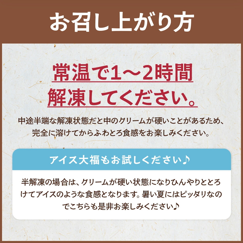 | 冷凍庫から出して 室温(20~25℃)で30分~1時間程度置いてお召し上がりください。夏場は表面のもちが柔らかくなった頃、中の餡が程よく冷たい状態がおすすめです。 ※冷蔵庫解凍はメーカー機器の機能や、庫内の置き場所により推奨はいたしません。餅がかたくなってしまう可能性がございます。 |