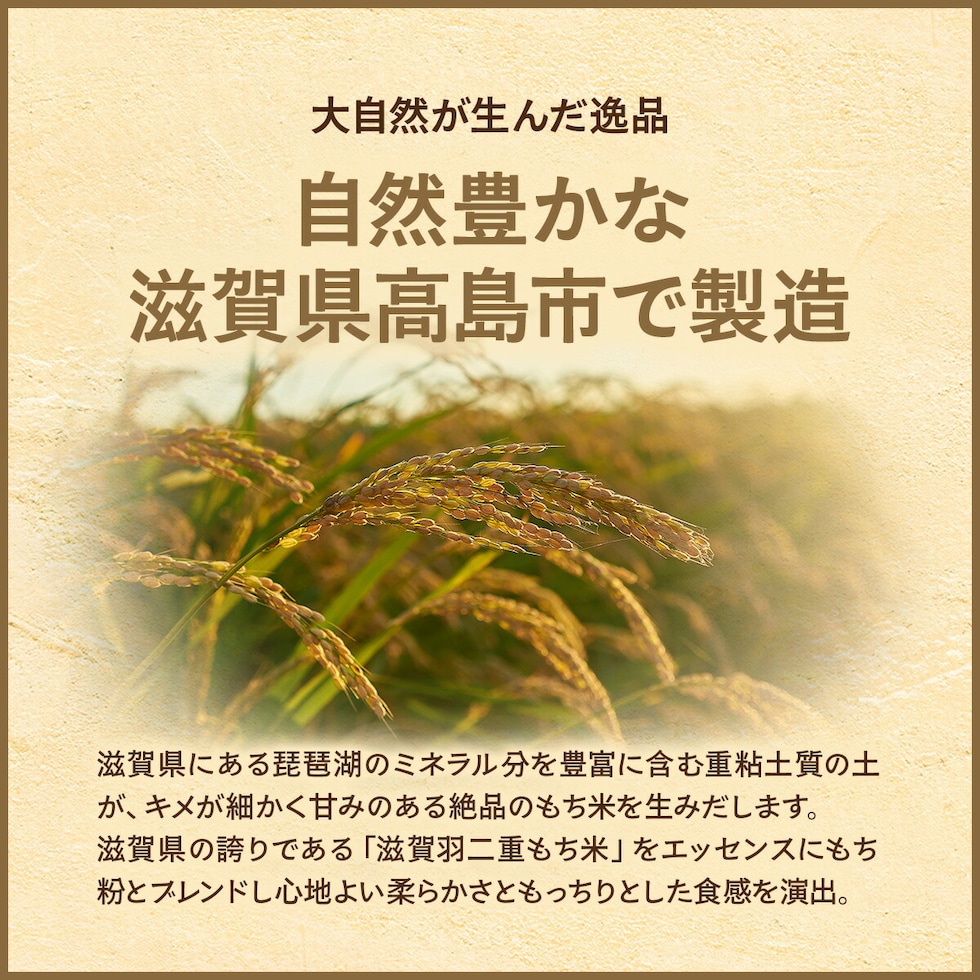| 見た目も華やかで、食べて楽しい!色とりどりのフルーツフレーバーを一箱に詰め込んだ、彩り豊かな12種セットです。口いっぱいに広がる果実の風味や、とろけるようなクリームの味わいが、特別なおやつ時間を演出します。ひとつひとつ丁寧に包まれた大福は、見た目も華やかで贈り物にもぴったり。目にも華やかで、お子さまから大人まで楽しめること間違いなし。ご家族で分け合ったり、お友達とのティータイム、大切な方へのちょっとしたギフトにもおすすめです。 ◆自然豊かな滋賀県高島市で製造しています これぞ、もち米の王様。「伸び」「こし」「粘り」に優れ、食べたときの絹のような、なめらかさが「羽二重」の名にふさわしく、最高級もち米として高く評価される高級ブランド「滋賀羽二重もち米」を使用。滋賀県にある琵琶湖のミネラル分を豊富に含む重粘土質の土が、キメが細かく甘みのある絶品のもち米を生みだします。 |