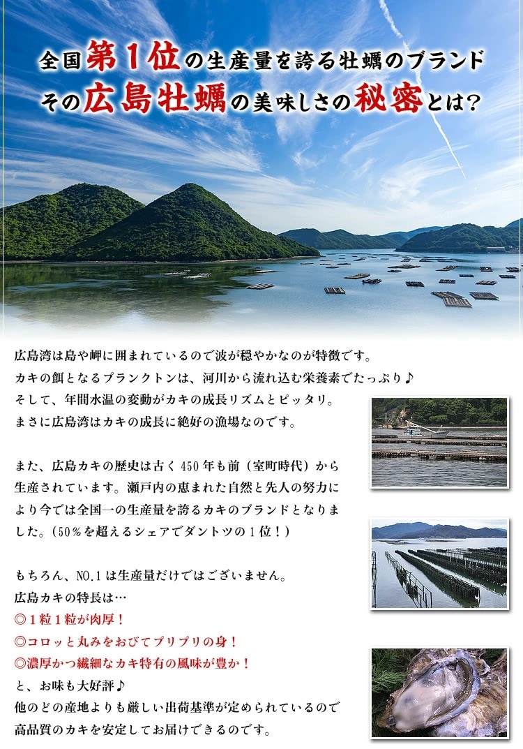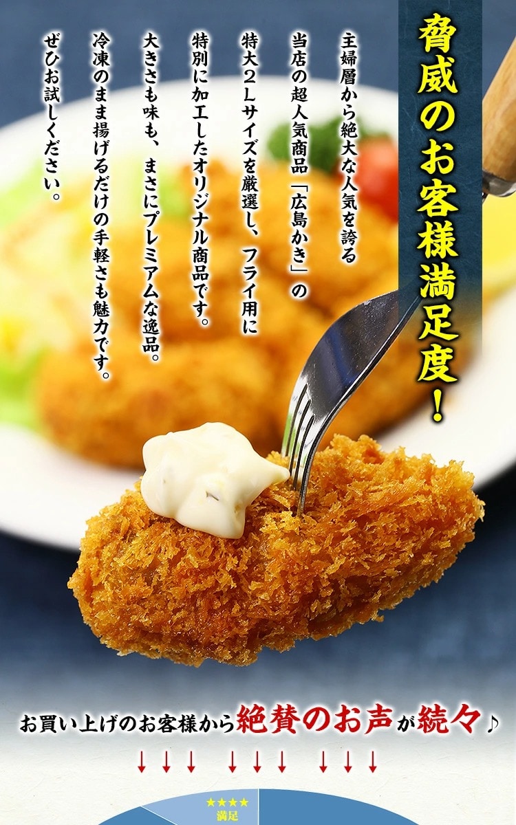 | ★甲羅組オリジナル商品!一般には流通していない完全数量限定! ★日本一のブランド広島県産だから安心・安全! ★食べ応え抜群!希少な特大サイズのみを厳選! ★面倒不要!揚げるだけの状態でお届け! ★1粒ずつ個別に冷凍!食べたい分だけ調理可能! 「カキフライは大好きなんですが、作るのが面倒くさい…」そんなお客様のために!面倒不要の、とっびっきり美味しいカキフライをご紹介します!日本一の生産量を誇る広島県産だから安心・安全!食べ応え抜群の希少な特大サイズを厳選し、揚げるだけの状態でお届け!面倒な手間は不要!また、1粒ずつ個別に冷凍してあるので、食べたい分だけ調理可能!主婦層から絶大な人気を誇る当店の定番「広島県産牡蠣2Lサイズ」使用だから、食べごたえ抜群です♪ |