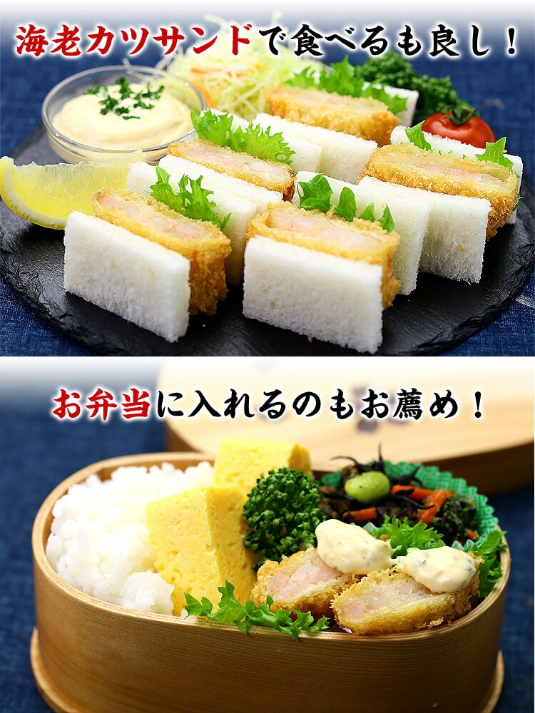 | ◎バナメイエビを丸ごとふんだんに使用! ◎余計なつなぎは使用しておりません♪ ◎冷凍のまま175℃の油で揚げるだけ♪ ◎外はサクサクッ!中はプリプリ食感! ◎忙しい時の一品やお弁当にもお薦め! バナメイエビを丸ごと入れたエビカツです。余計なつなぎを使用していないため、エビ本来の旨味と食感が味わえます。 冷凍のまま揚げるだけなので調理は簡単!冷凍庫にストックしてあるととっても便利!夕食の一品や、お弁当におすすめです♪ |