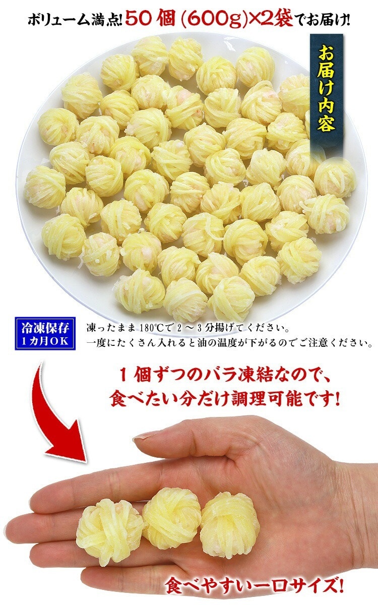 | エビポテト巻き1.2kg(600g×2パック) 原産国:ベトナム <原材料>ジャガイモ、海老、たまねぎ、イトヨリすり身、砂糖、食塩、卵白粉、でん粉、胡椒、加工でん粉、調味料(アミノ酸) |