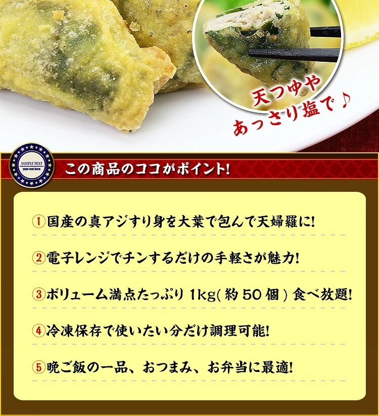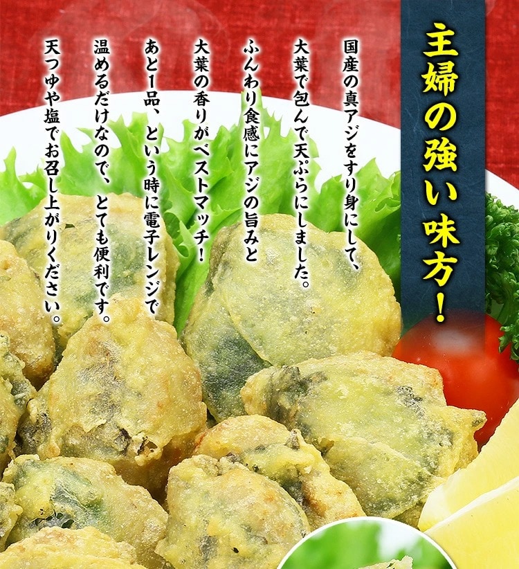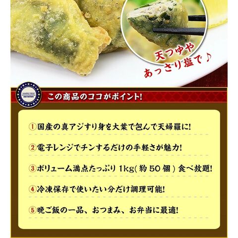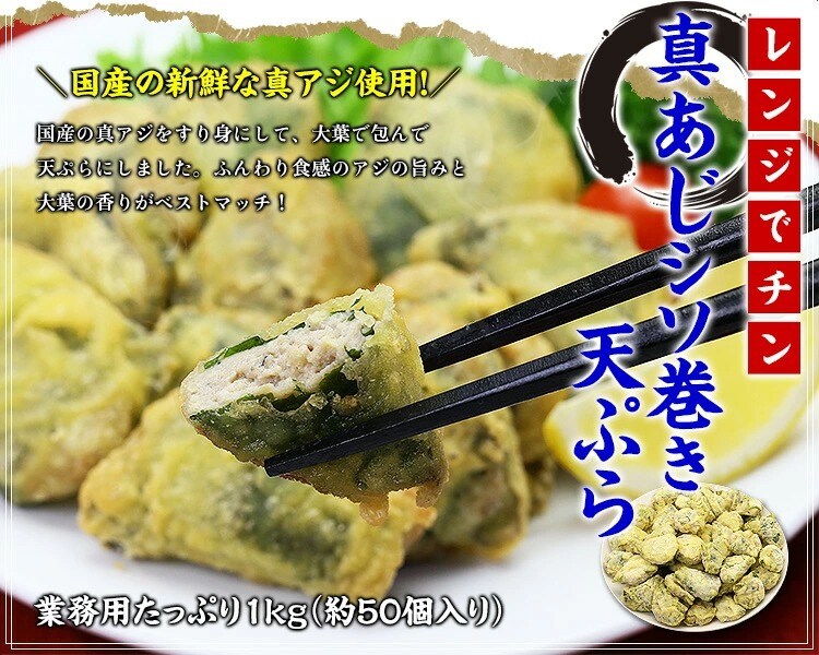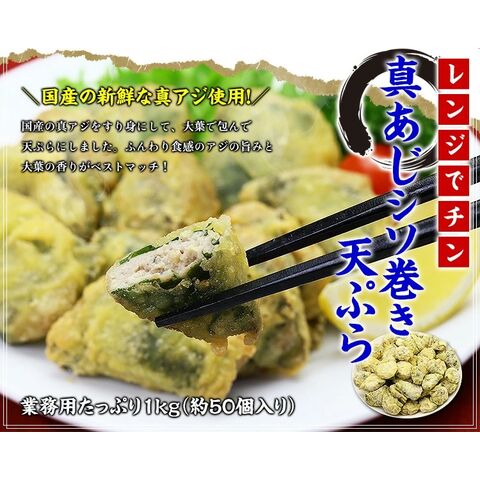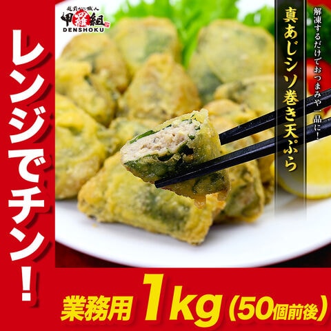 アジの旨みと大葉の香りがベストマッチ!国産真あじシソ巻き天ぷら業務用たっぷり1kg(約50個入り) あじ天婦羅 アジ天婦羅 あじ天ぷら アジ天ぷら 冷凍食品