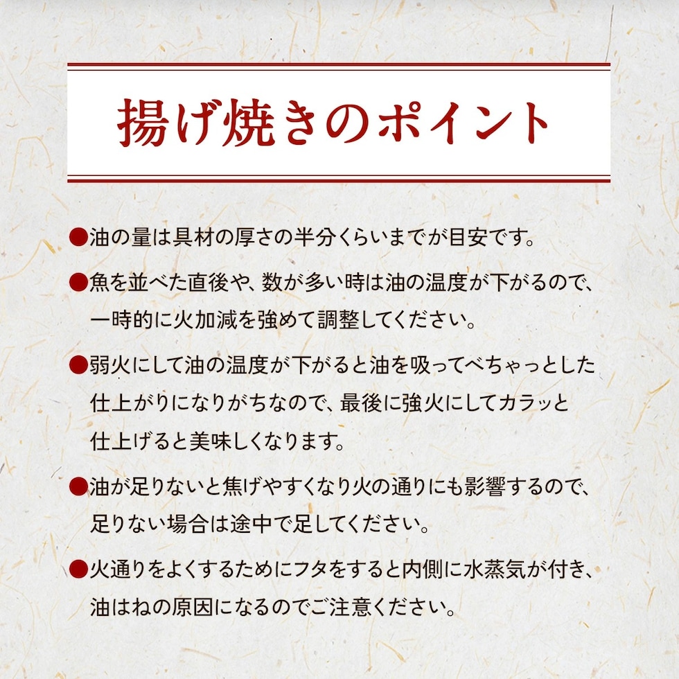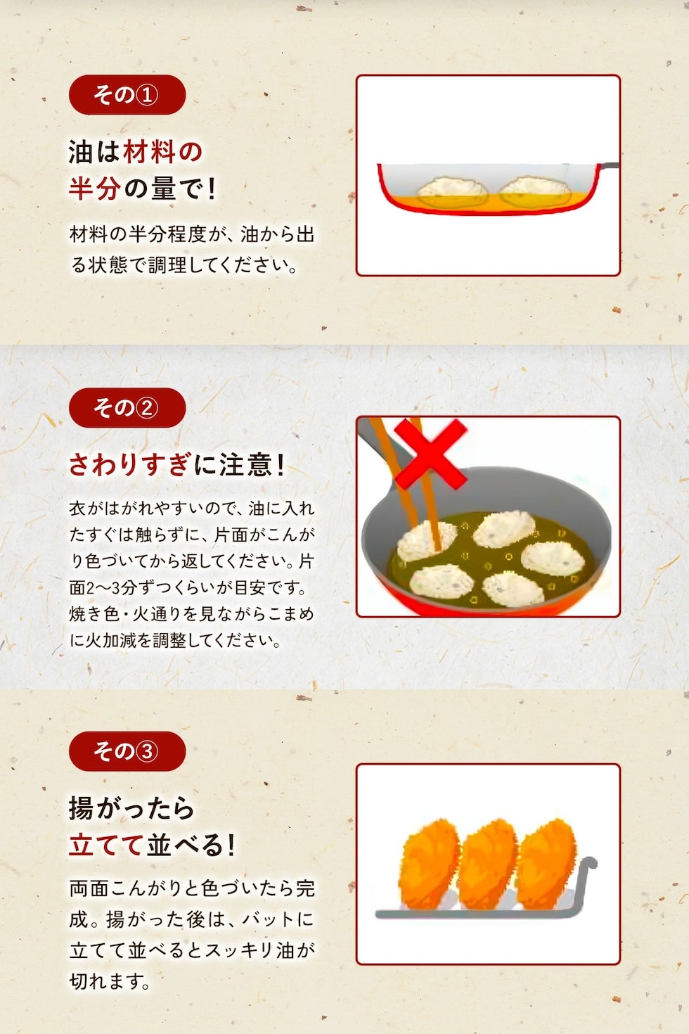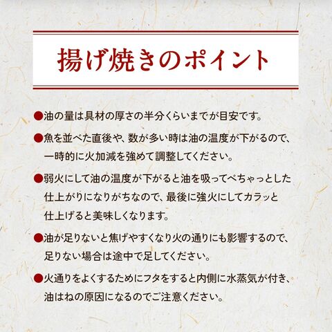 | 170~175℃に熱した油で、時々返しながら3~4分揚げて下さい。油の量や調理などにより多少異なります。 |