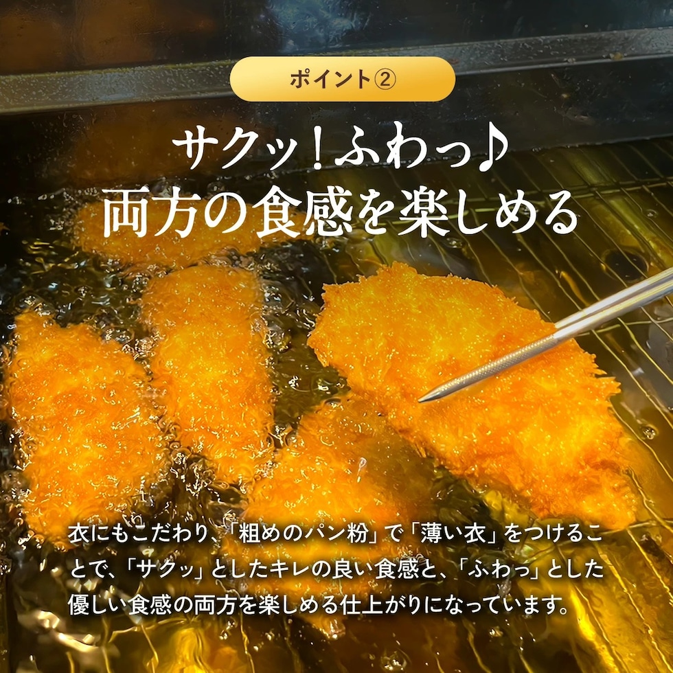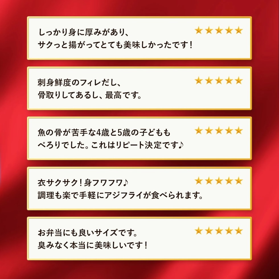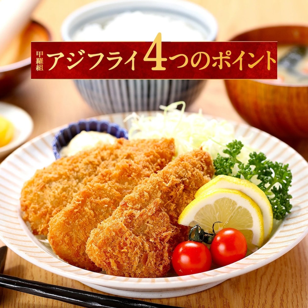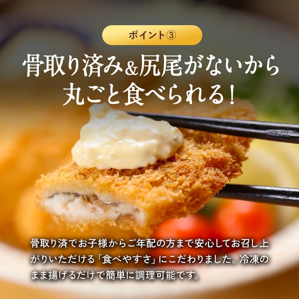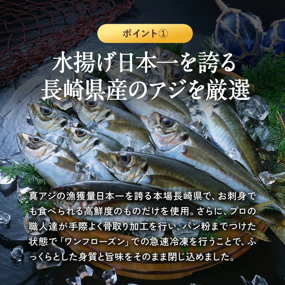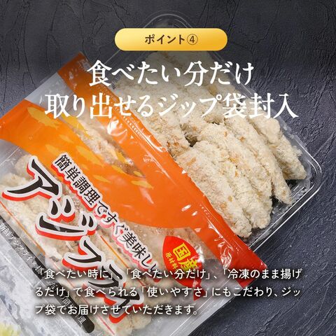 | ★骨取り済だから食べやすさ抜群!お子様から年配の方まで美味しく食べられる♪ ★お刺身鮮度で、脂のりの良い新鮮なマアジのみを厳選! ★水揚げから一度も冷凍せずに粉付けまで行うワンフローズン製法! ★衣のつけ方にもこだわり、「外サクッ!」「中ふわっ♪」食感で、アジフライの魅力を存分に♪ ★「食べたい時に」「食べたい分だけ」「冷凍のまま揚げる」抜群の使い勝手! アジフライはスーパーでもよく販売されている、人気のお惣菜です。そんな日本の食卓には欠かせないアジフライですが、お客様とお話していると 「アジフライは好きだけど、食べている時に骨の固い部分が気になる…」 「骨がついていると、子供がなかなか食べてくれない…」 というお声を耳にすることがあります。そんなお悩みをお持ちのお客様に、今回は当店の「骨取り済 サクッ!ふわっ♪絶品アジフライ」をご紹介します!当店のアジフライは、マアジの漁獲量日本一を誇る本場長崎県で、お刺身でも食べられる高鮮度の原料だけを使用しています。さらに、プロの職人達が手際よく骨取り加工を行い、パン粉までつけた状態で「ワンフローズン」での急速冷凍を行うことで、新鮮なアジのふっくらとした身質と旨味をそのまま閉じ込めました。また衣にもこだわり、「粗めのパン粉」で「薄い衣」をつけることで、「サクッ」としたキレの良い食感と、「ふわっ」とした優しい食感の両方を楽しめる、絶品のアジフライに仕上がっています!さらに、骨取り済でお子様からご年配の方まで安心してお召し上がりいただける「食べやすさ」と「食べたい時に」、「食べたい分だけ」、「冷凍のまま揚げるだけ」で食べられる「使いやすさ」にもこだわりました。当店が自身をもってオススメする、「骨取り済 サクッ!ふわっ♪絶品アジフライ」、ぜひご賞味ください! |