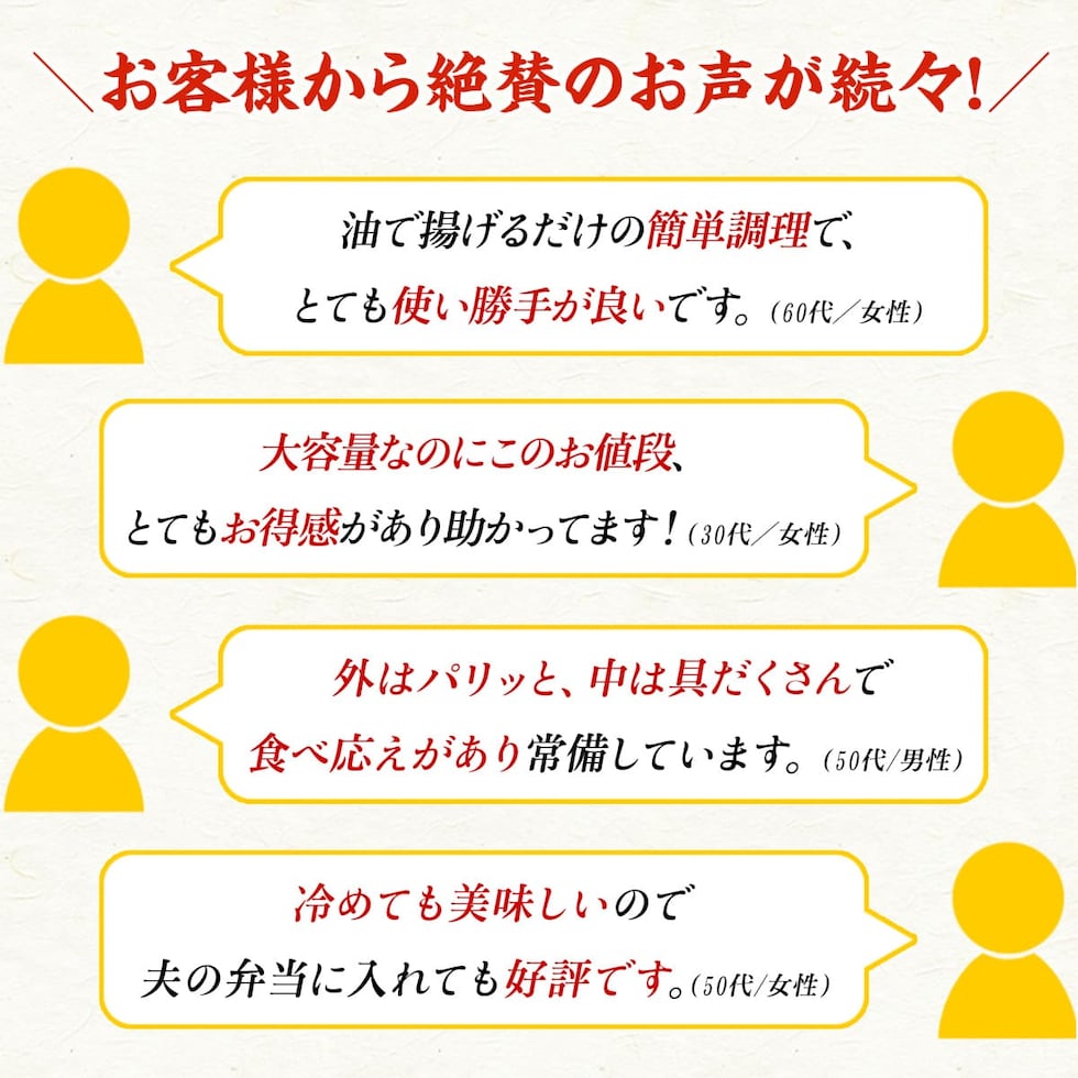 たけのこ、にんじん、キャベツ、春雨、たまねぎ、きくらげ、豚肉をニンニクで炒め風味良く仕上げました!冷凍のまま揚げるだけと調理はとっても簡単。晩ごはんの一品やお弁当のおかずにピッタリです♪ |