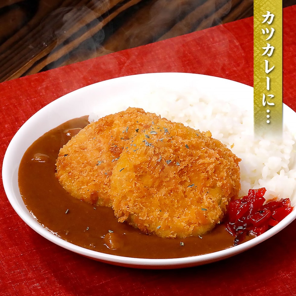 | 肉アツメンチカツ 100g前後×10個 <原材料>食肉[牛肉(オーストラリア)、豚肉]、たまねぎ、粒状植物性たん白、液卵白、パン粉、豚脂、ゼラチン、粗ゼラチン、食塩、小麦粉、香辛料、衣[パン粉、フライミックス粉(小麦粉、でん粉、粉あめ、その他)、植物油脂、コーンフラワー、フライミックス粉(小麦粉、乾燥卵白、食塩、でん粉)、コーングリッツ]/焼成Ca、着色料(カロテノイド、カラメル)、膨脹剤、調味料(アミノ酸)、乳化剤、 (一部に小麦・卵・乳成分・牛肉・大豆・豚肉・ゼラチンを含む) |