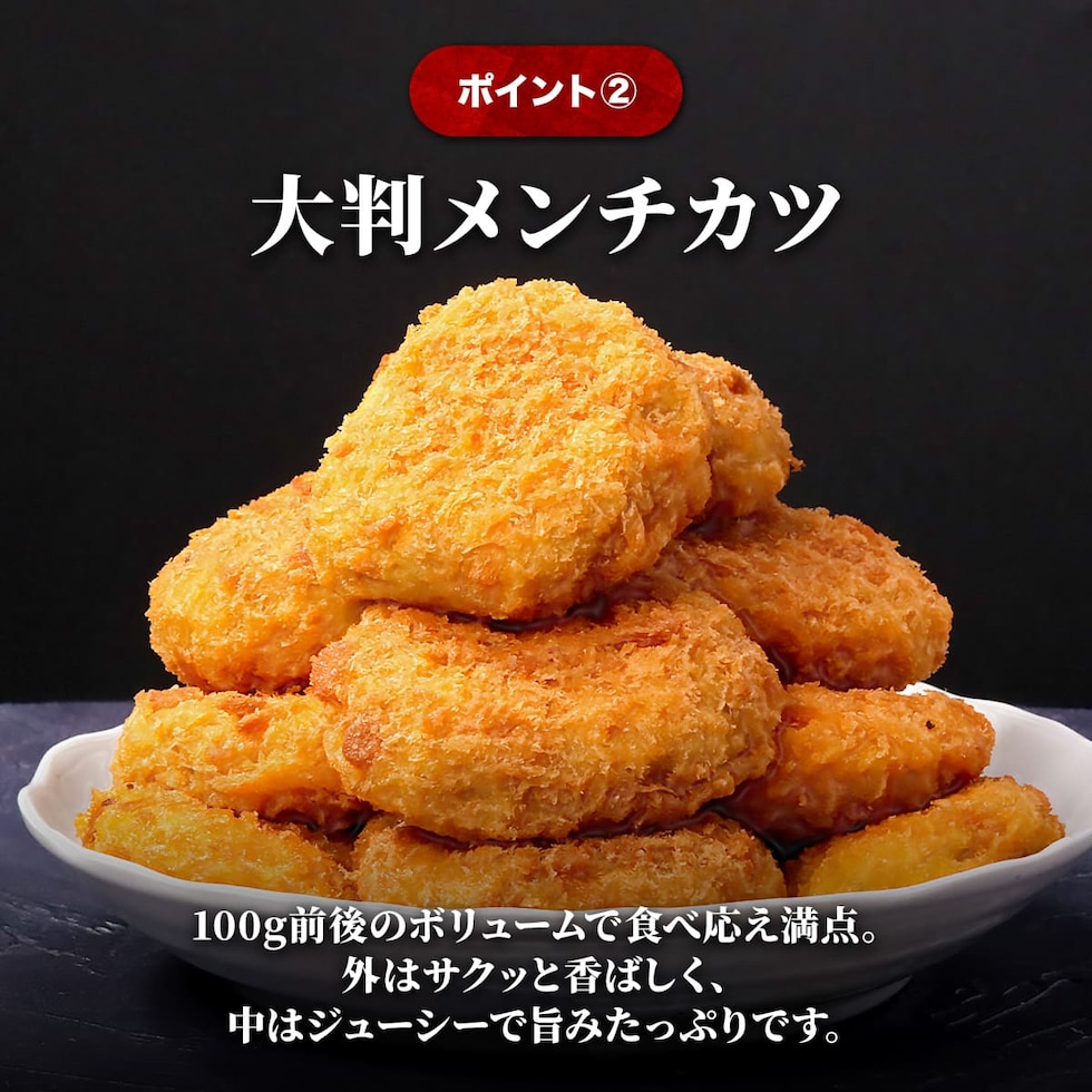 ◎ひと手間かけた二層仕立ての技ありメンチカツ! ◎中生地には粗びきのお肉がぎっしりでボリューム満点 ◎外生地が肉汁をしっかり閉じ込めるから、とってもジューシー♪ ◎1個100g前後の大判サイズ ◎焙焼パン粉を使った、サクッと歯切れのよい衣 ◎晩御飯の一品からお弁当まで、使い勝手抜群 外はサクッ、中はジューシー。 粗びき肉の旨みを存分に楽しめる、本格派のメンチカツです。 厳選した豚肉と牛肉をあらびきに仕上げ、食感と肉の風味を最大限に引き出しました。 玉ねぎの甘みと香ばしい衣が合わさり、ひと口ごとに満足感あふれる味わいです。 大判サイズ(約100g前後)で、晩御飯の1品やお弁当にもピッタリ! 冷凍のまま調理可能なので、揚げるだけでプロ仕様の本格メンチカツをお楽しみいただけます。 |
