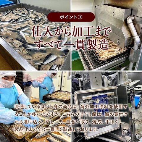 | ◆原料仕入から一次加工まで一貫製造! 量販店などで流通しているほぐし身の商品は、海外加工原料使用しているところが多いです。例えば、サバ原料をベトナムへ送り込み→現地にて焼成・ほぐし・再凍結→輸入→自社で味付加工→販売 。しかし、このの商品は ノルウエー産サバ原料を買付→国内工場にて一次処理(漬け込み→蒸し→皮・血合い取→焼成→手ほぐし)→製品化。他社がやらないことをあえて手間暇かけて加工することにより、美味しさを実現しました。 ◆一晩漬け込み&手ほぐし 何といっても一番の特徴は噛めば噛むほど出てくる旨みとゴロッと感です。振り塩やシーズニング等ではなく、秘伝の調味タレに一晩漬け込み無添加にて加工することにより 素材の味を邪魔しない丸みのある味付と安全・安心の商品ができあがります。また、全工程を機械に任せるのではなく人の手でほぐすことでゴロッと感を出すことができます。 |