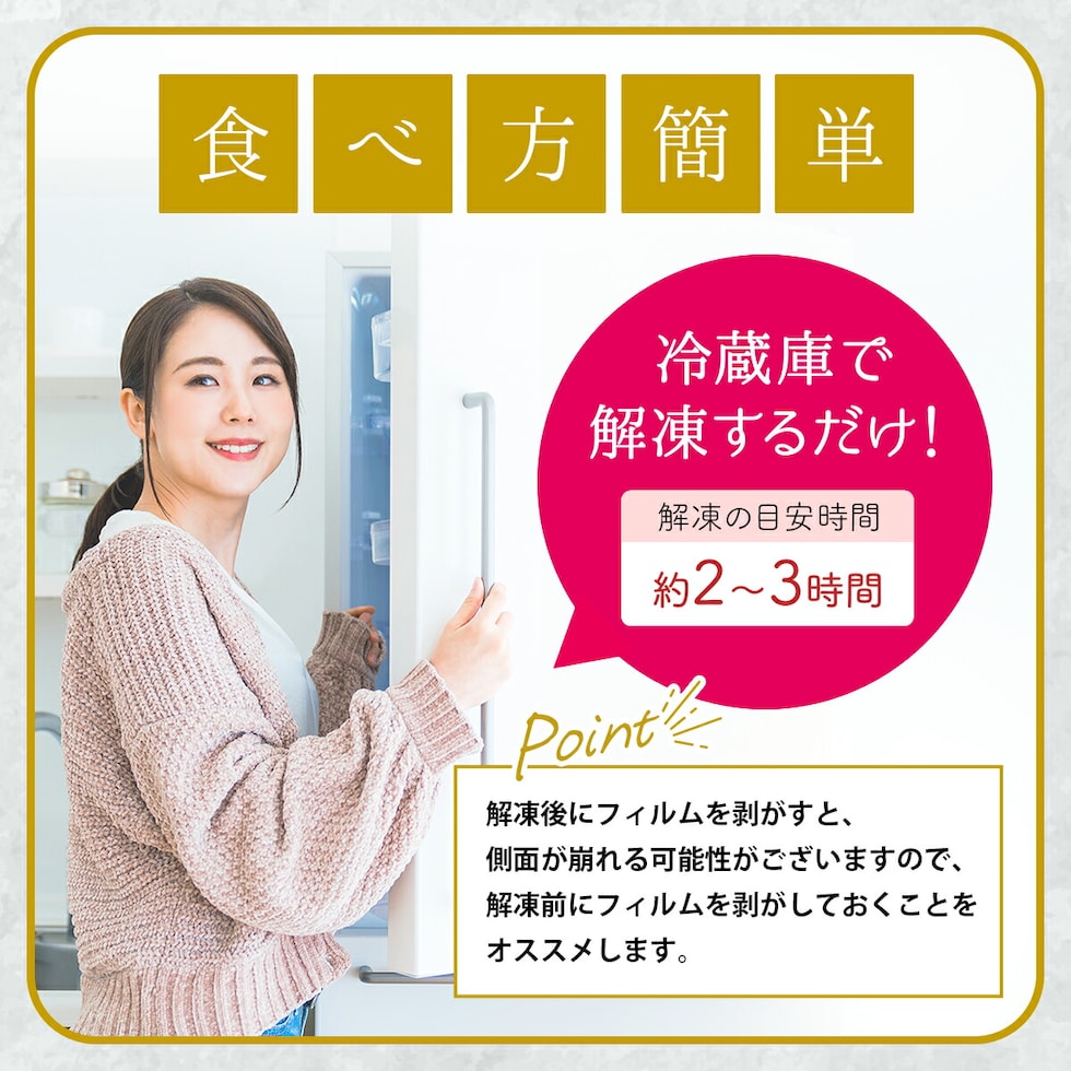冷蔵庫で解凍してお召し上がりください (2-3時間が目安です) 解凍後は必ず冷蔵庫に保管しお早めにお召し上がりください。 |