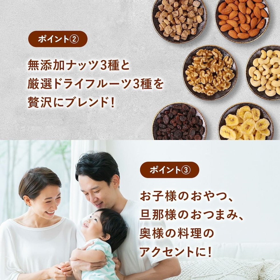 ◎当店大人気の無添加ナッツ3種類と厳選ドライフルーツ3種類を贅沢にブレンド! |