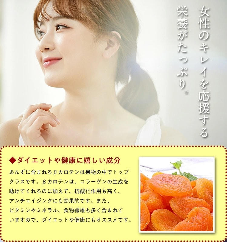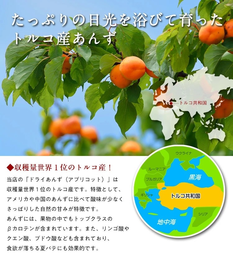 アプリコットとは「あんず」のことで、甘みの中に酸味があるのが特徴です。今回は、酸味が少なく、ふっくらと柔らかい食感が特徴のトルコ産のドライアプリコットをご用意しました。栄養バランスも良く、ビタミンやミネラルが豊富に含まれた自然食材です。ジューシーな果肉はそのまま食べていただくだけでなく、刻んでヨーグルトやアイスにトッピングしたり、紅茶やリキュールに漬け込んだり、ジャムの材料にしたりなど、いろんな食べ方でお楽しみいただけます。 |